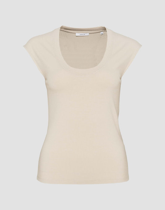 DOB Top, Rippe, Rundhals, kurze Knopfleise in der Mitte mit Funktion, Pipings an Hals- und Ärmelöffnung, Saum mit Kräuselungen
