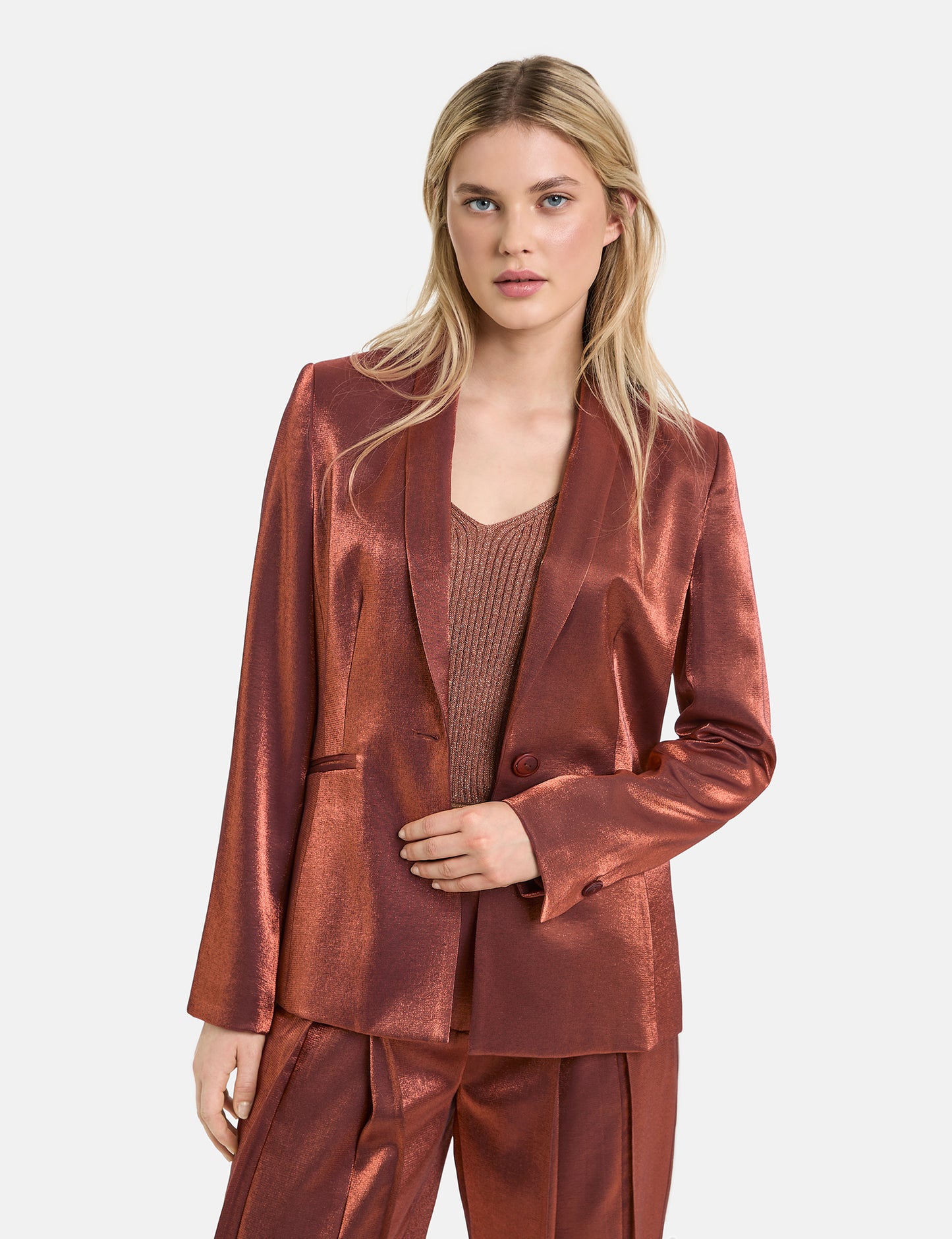 Shiny-Effekt. Veredle deinen Look mit diesem glänzenden Blazer! Sein taillierter Style mit Revers sowie der metallische Shiny-Effekt verleihen neue Eleganz und einen Hauch von Luxus. Trage ihn zusammen mit der passenden Hose im Balloon-Fit für einen umwerfenden Anzug-Look, der garantiert alle Blicke auf sich zieht. Wow!
