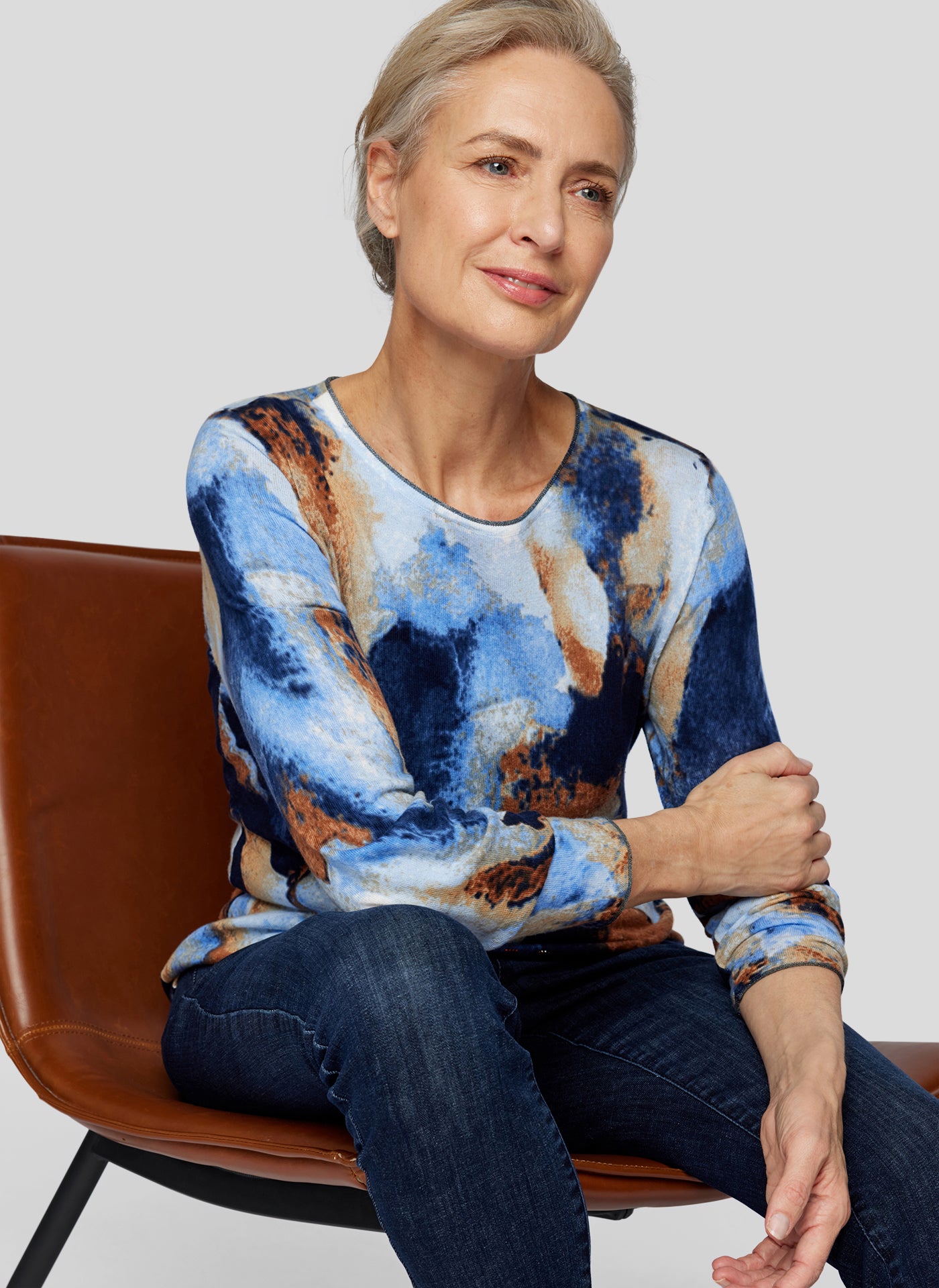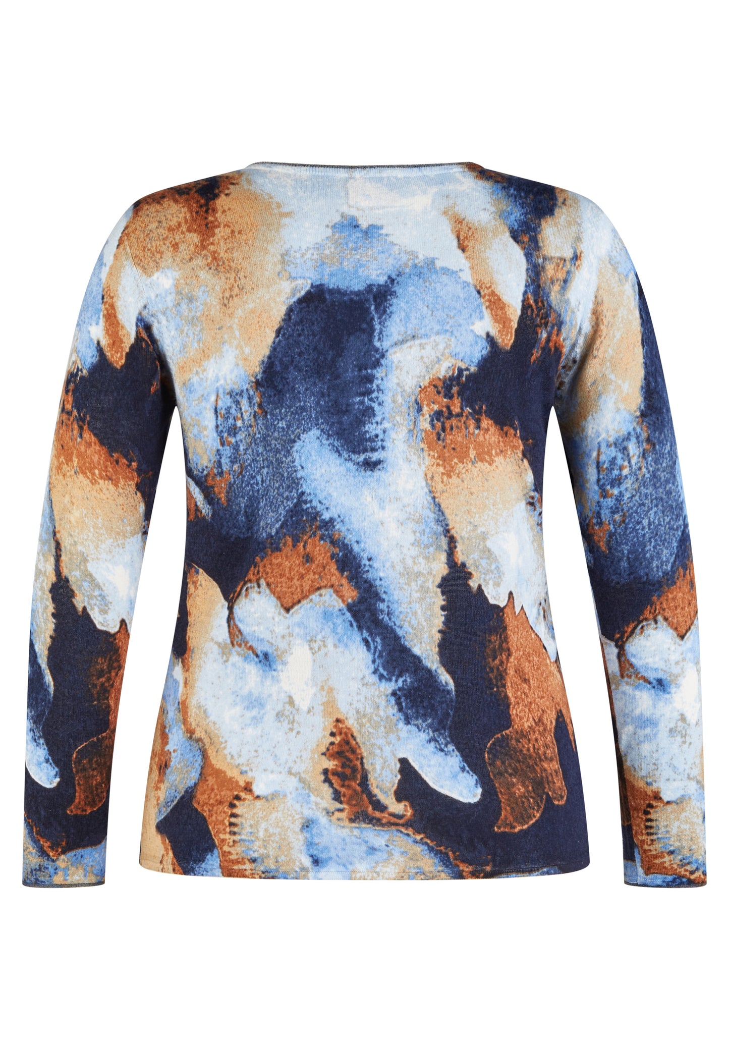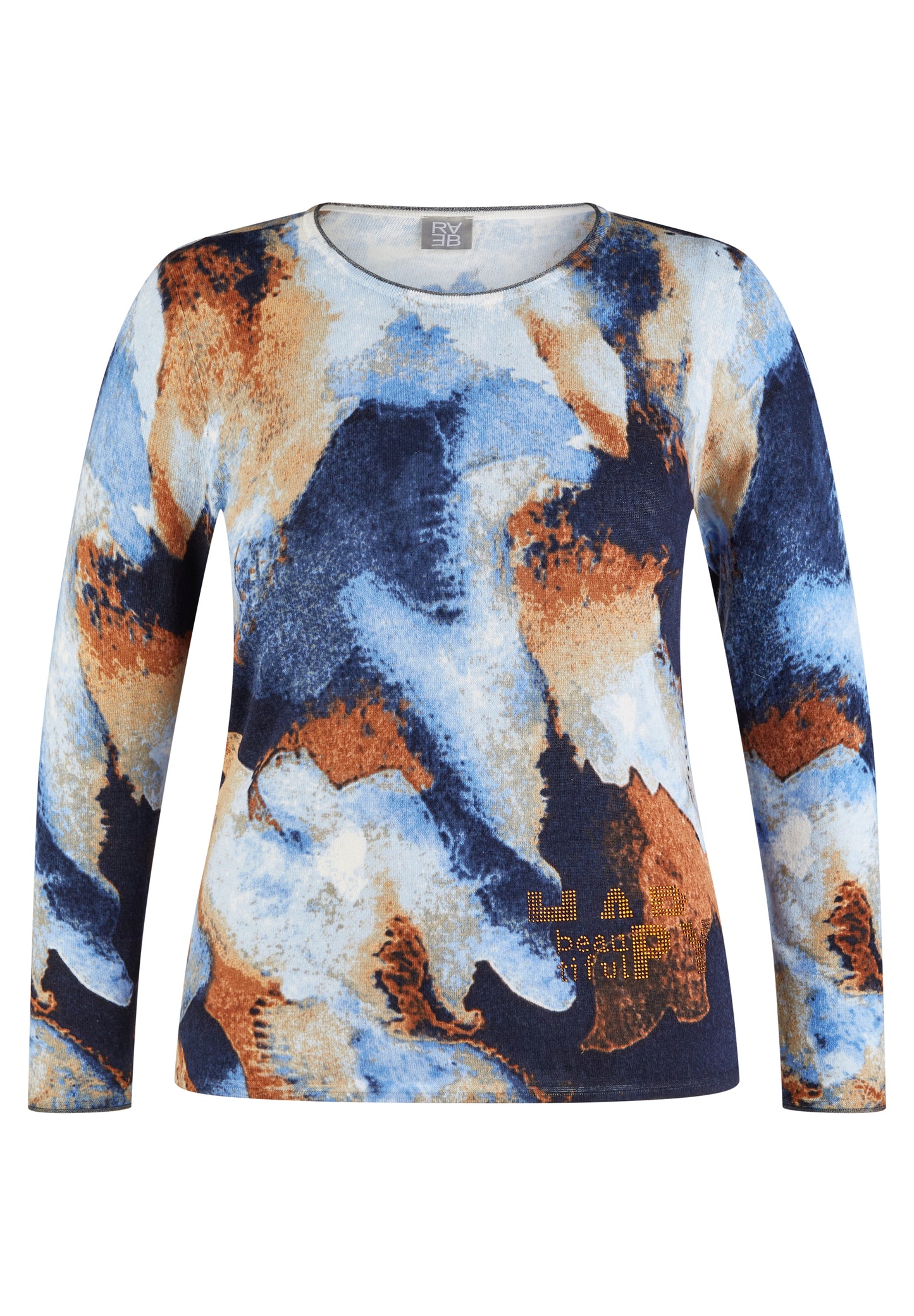 Erleben Sie Komfort und Stil mit unserem einzigartigen Pullover, der Kunst und Mode auf wunderbare Weise vereint. Dieses auffällige Kleidungsstück ist perfekt für modebewusste Frauen, die gerne ein Statement setzen. Abstraktes, künstlerisches Muster in Blau-, Braun- und Weißtönen. Weicher und atmungsaktiver Stoff für ultimativen Tragekomfort. Schriftzug "Beautiful" aus funkelnden Strasssteinen als Highlight.100 % Baumwolle