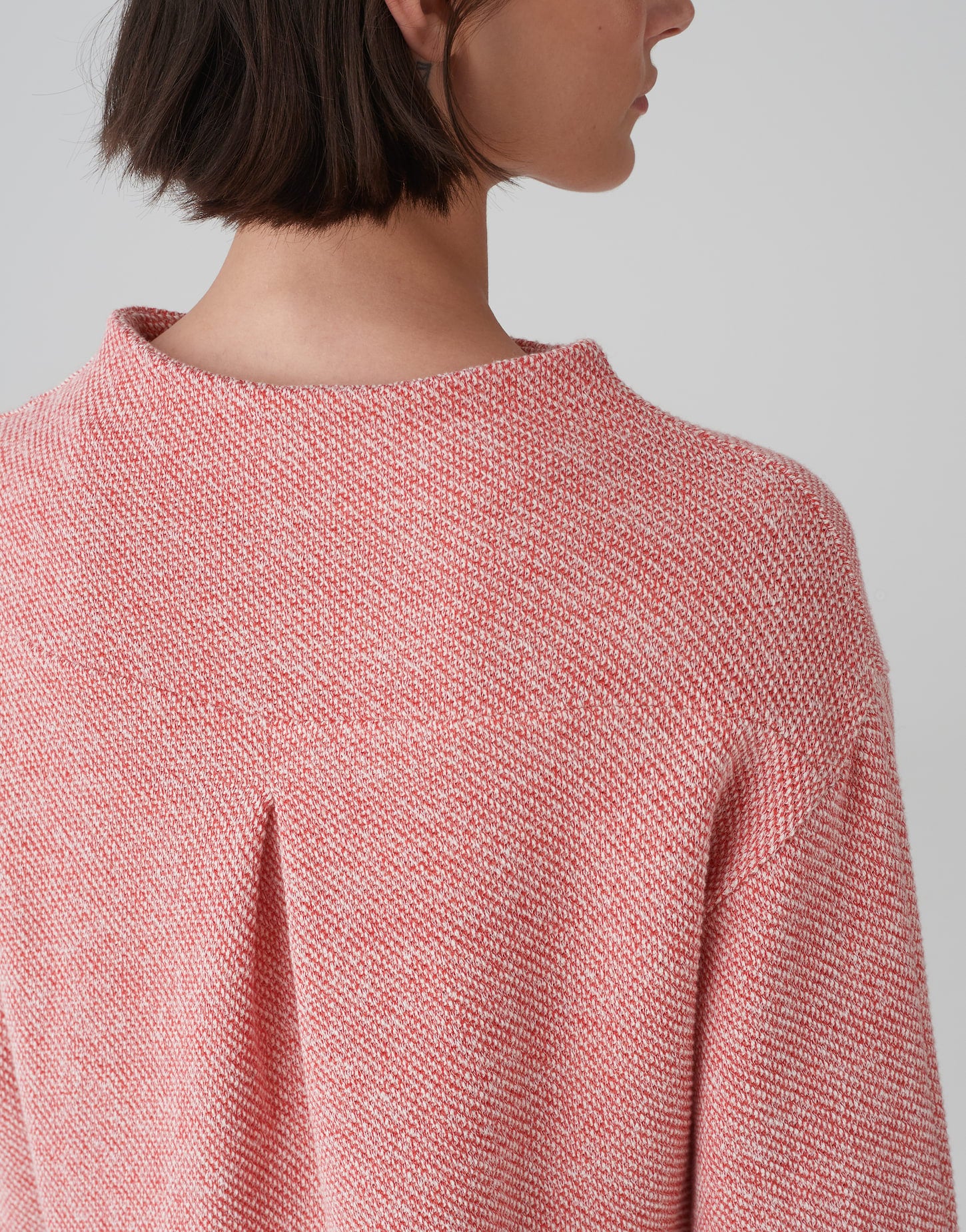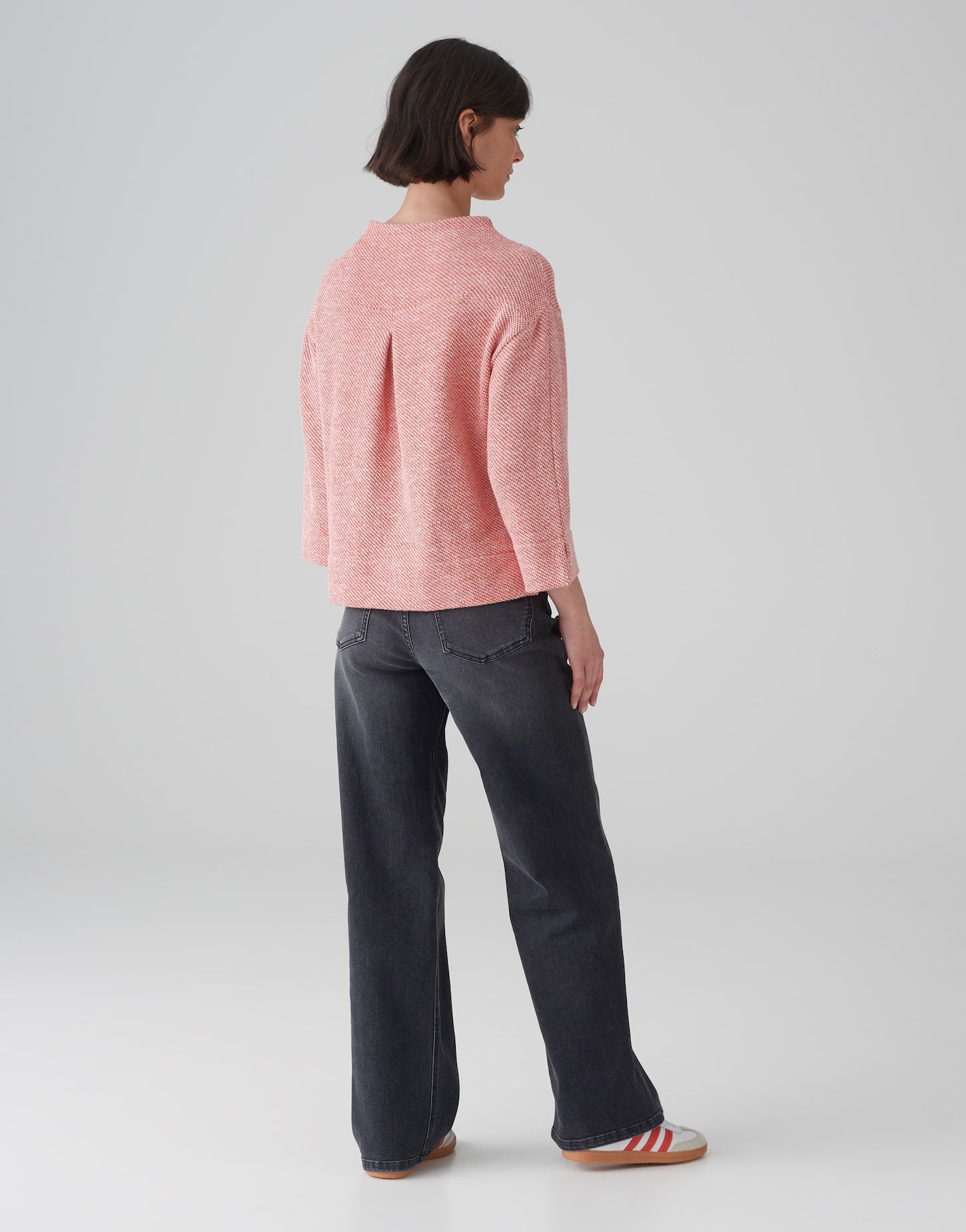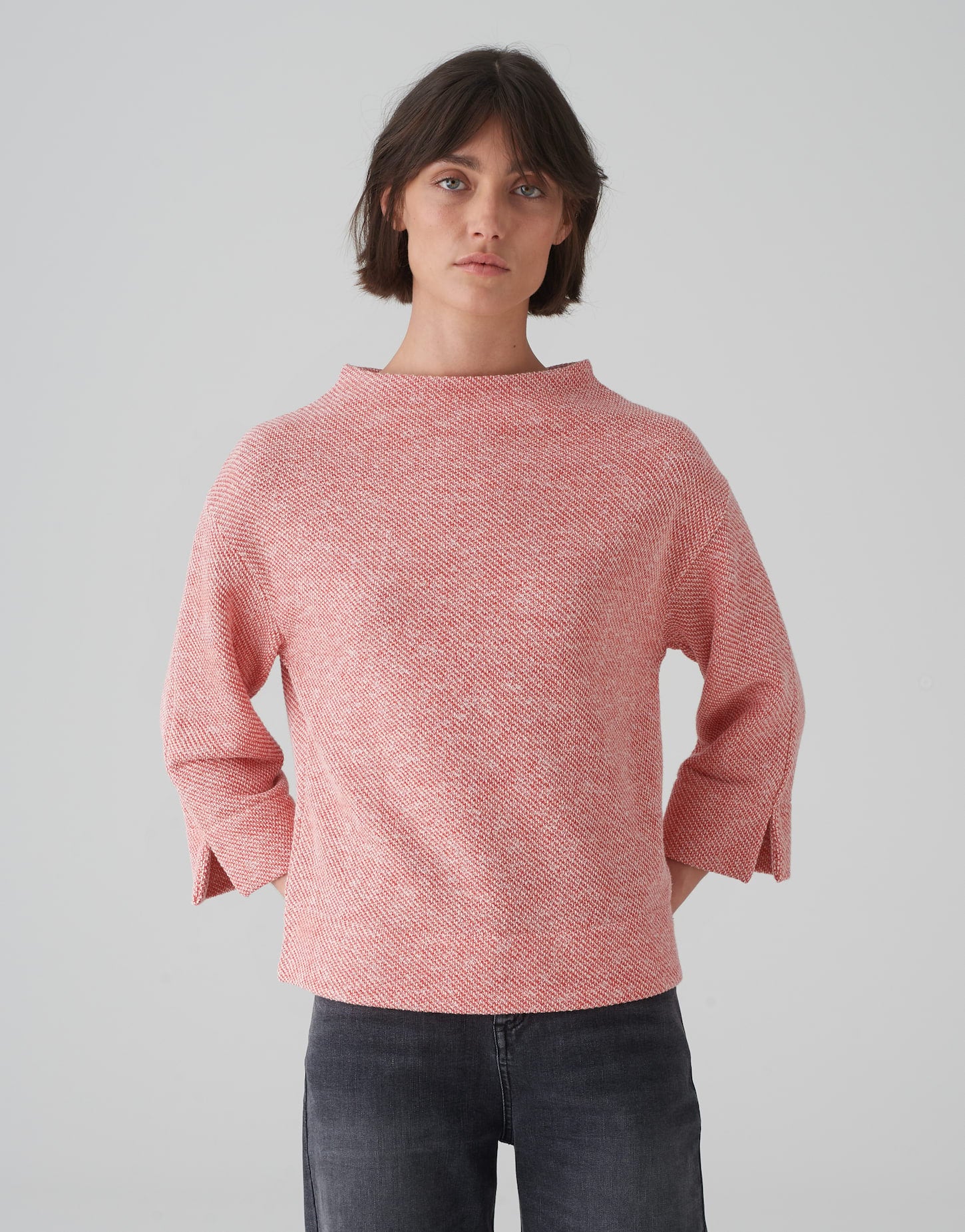 Weite Passform, gerader Schnitt, leicht verkürzt geschnitten, verkürzter Arm, Funnel Neck, Rückenlänge ca. 59 cm bei Größe 36, Model Größe 177 cm – trägt Größe 36, Sweatware, strukturierte Oberfläche, zweifarbiges Muster, Falte im Rücken, Schlitze in den Seiten und Ärmelbund, überschnittene Schultern