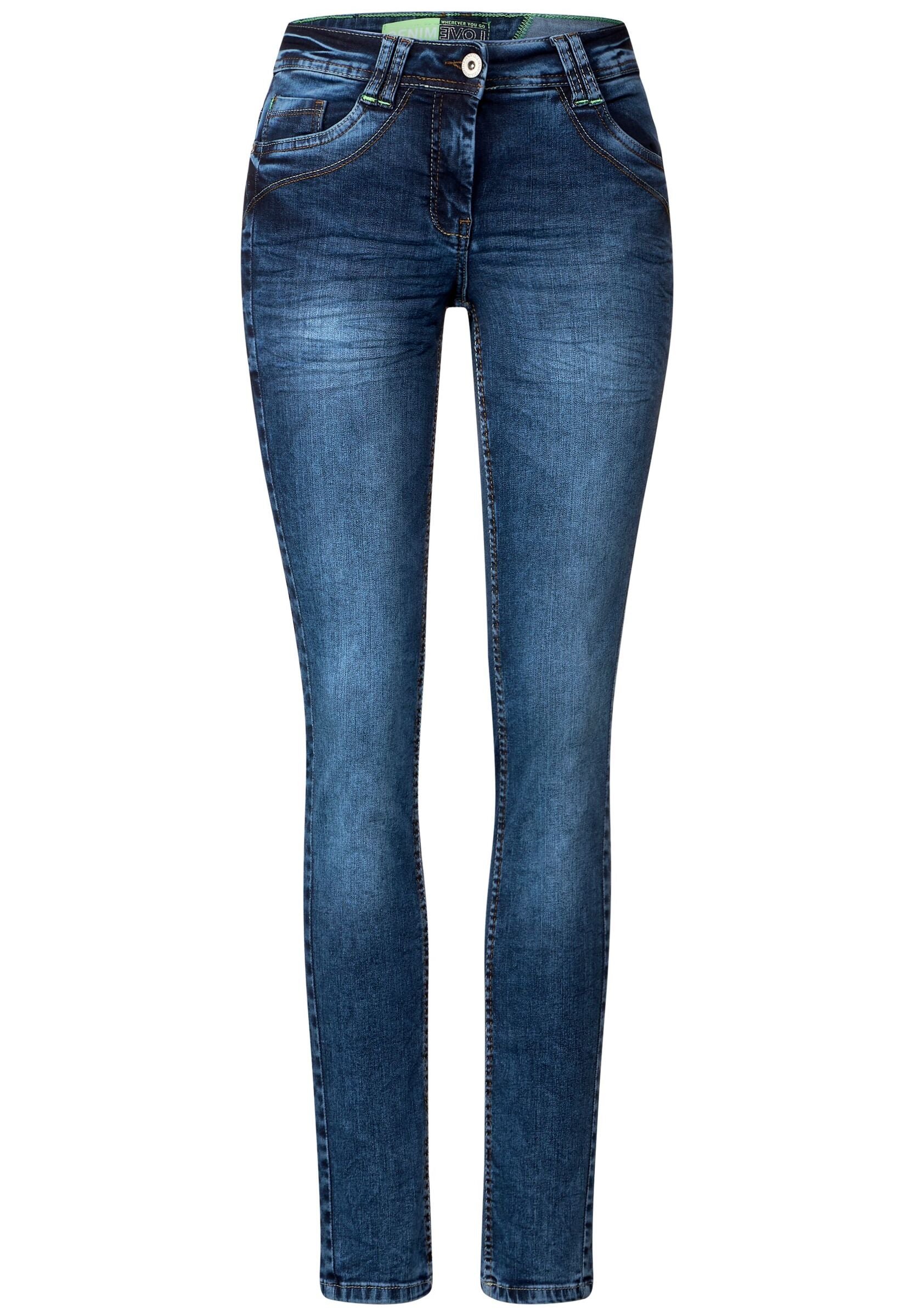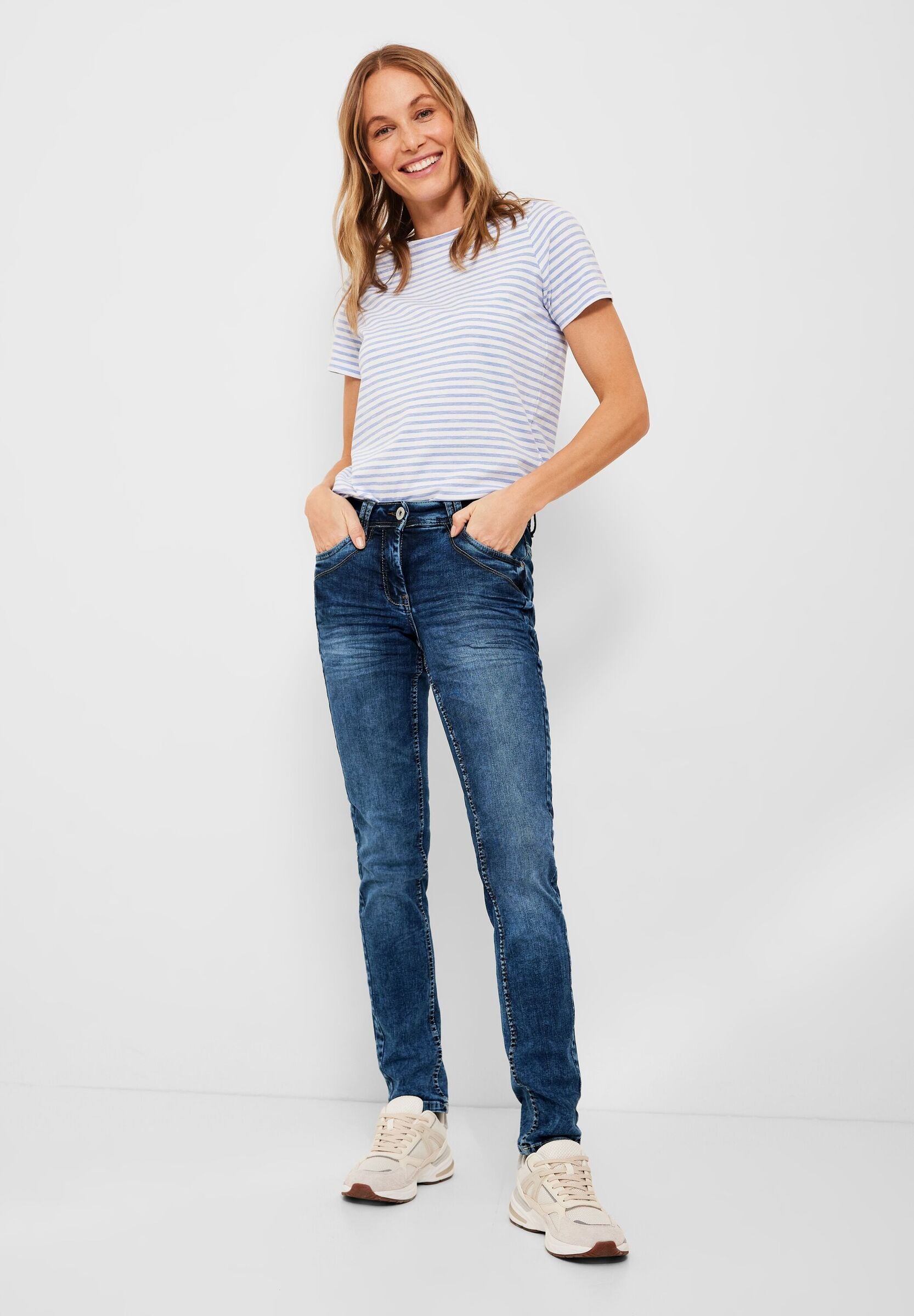 Denim-Liebe! Gemütlich geschnittene Loose Fit Damenhose im Style Scarlett von CECIL. Mit mittlerem Bund und im elastischen Baumwollmix trägt sie sich bequem und macht jede Bewegung mit. Der 5-Pocket-Style in mittelblauer Waschung wird durch schmale Beine und einem Reißverschluss mit Knopf perfekt ergänzt.