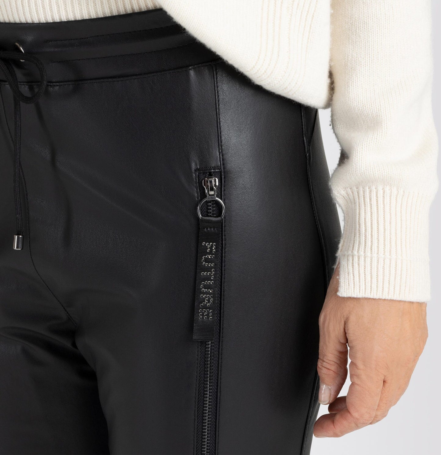 Relaxed Fit schmal zulaufendes Bein normale Leibhöhe lässiger, sportiver Look Schlupfhose mit Kordelzug aus veganem premium Stretch Leder modische Taschenlösung an der Vorderhose mit Reißverschluß Bündchen am Beinabschluß Fußweite bei Größe 36: 26cmpolyurethan (PUR) 73%, polyamide o Nylon (PA) 27%