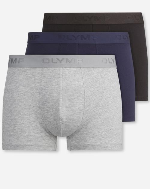 Mit den OLYMP Boxershorts im Dreierpack guckt bestimmt niemand verdutzt aus der Wäsche. Die hochwertigen Retropants in anliegender Passform mit kurzem Bein und elastischem Logo-Bund verfügen über hervorragende Trage- und Pflegeeigenschaften. Obendrein überzeugen die stilvollen Unterhosen durch geschmeidigen Baumwoll-Stretch in den drei zeitlosen Farbstellungen Schwarz, Blau und Grau.<
