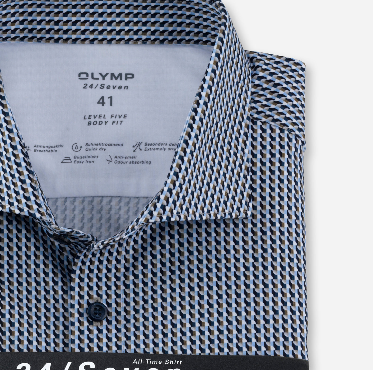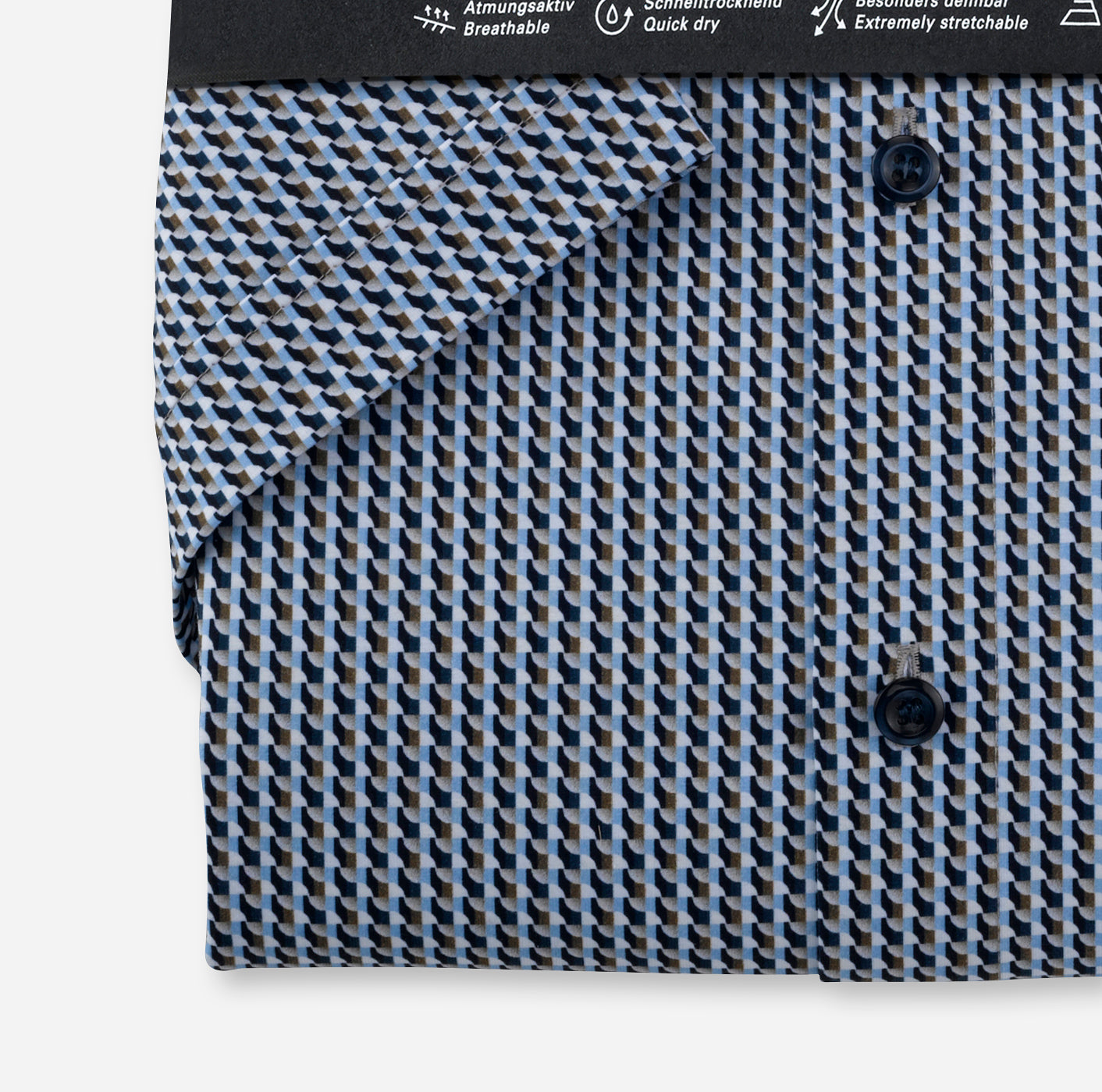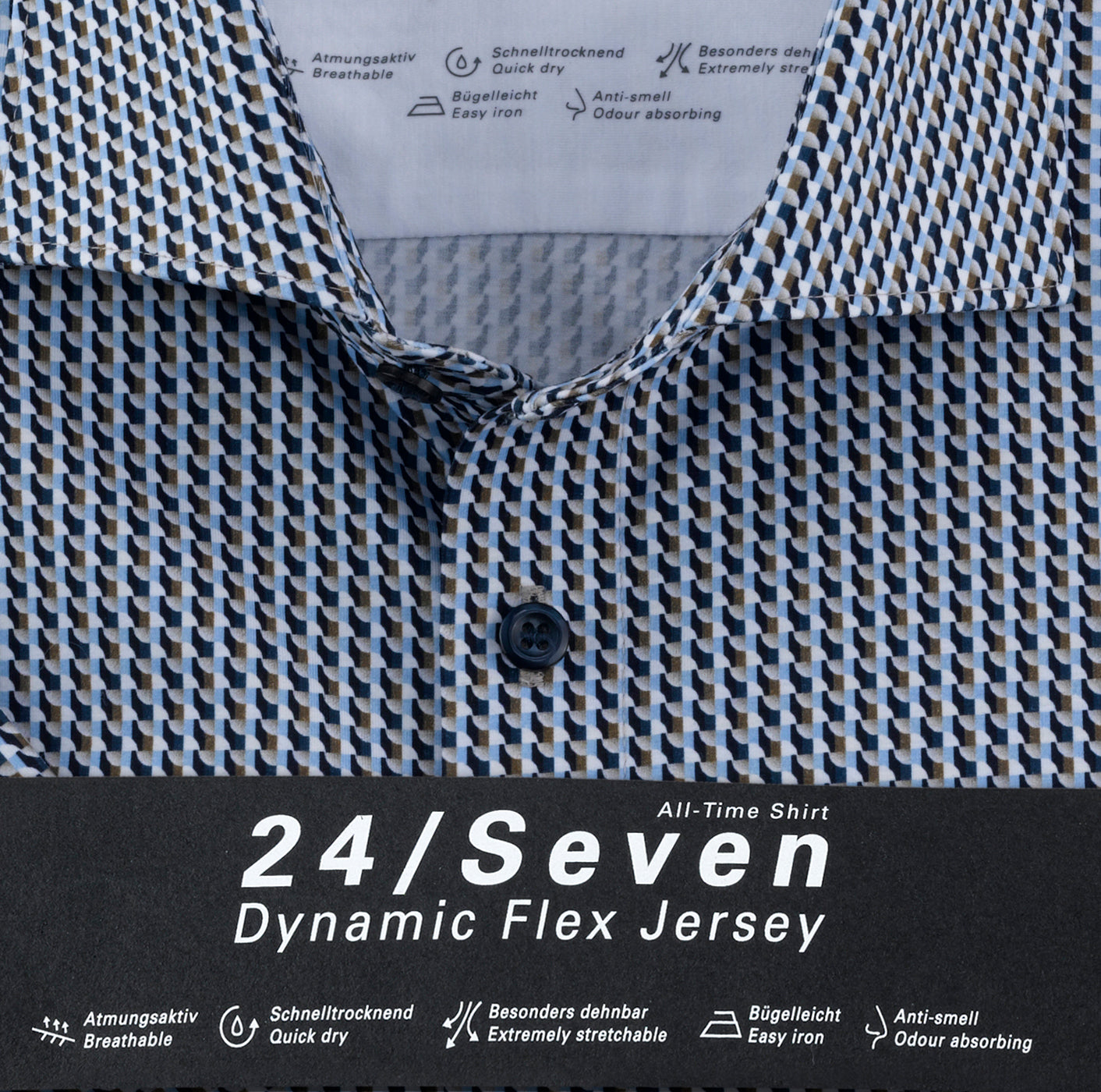 Als perfekte Einheit aus Dessin, Material und Schnittführung überzeugt dieses stylishe OLYMP Level Five Kurzarmhemd mit coolem Retro-Print. Der vielfach beliebte 24/Seven Dynamic Flex Jersey begeistert hier durch eine leichte, glatte Baumwollqualität, gefertigt nach hochwertigen GREEN CHOICE Standards. Ein hoher Stretch-Anteil sorgt dabei trotz schmaler Body-Fit-Silhouette für vollen Bewegungsradius. Ein rundum gelungener Allrounder für Business und Freizeit, ausgestattet mit elegantem Kent.92% Baumwolle, 8% Elasthan