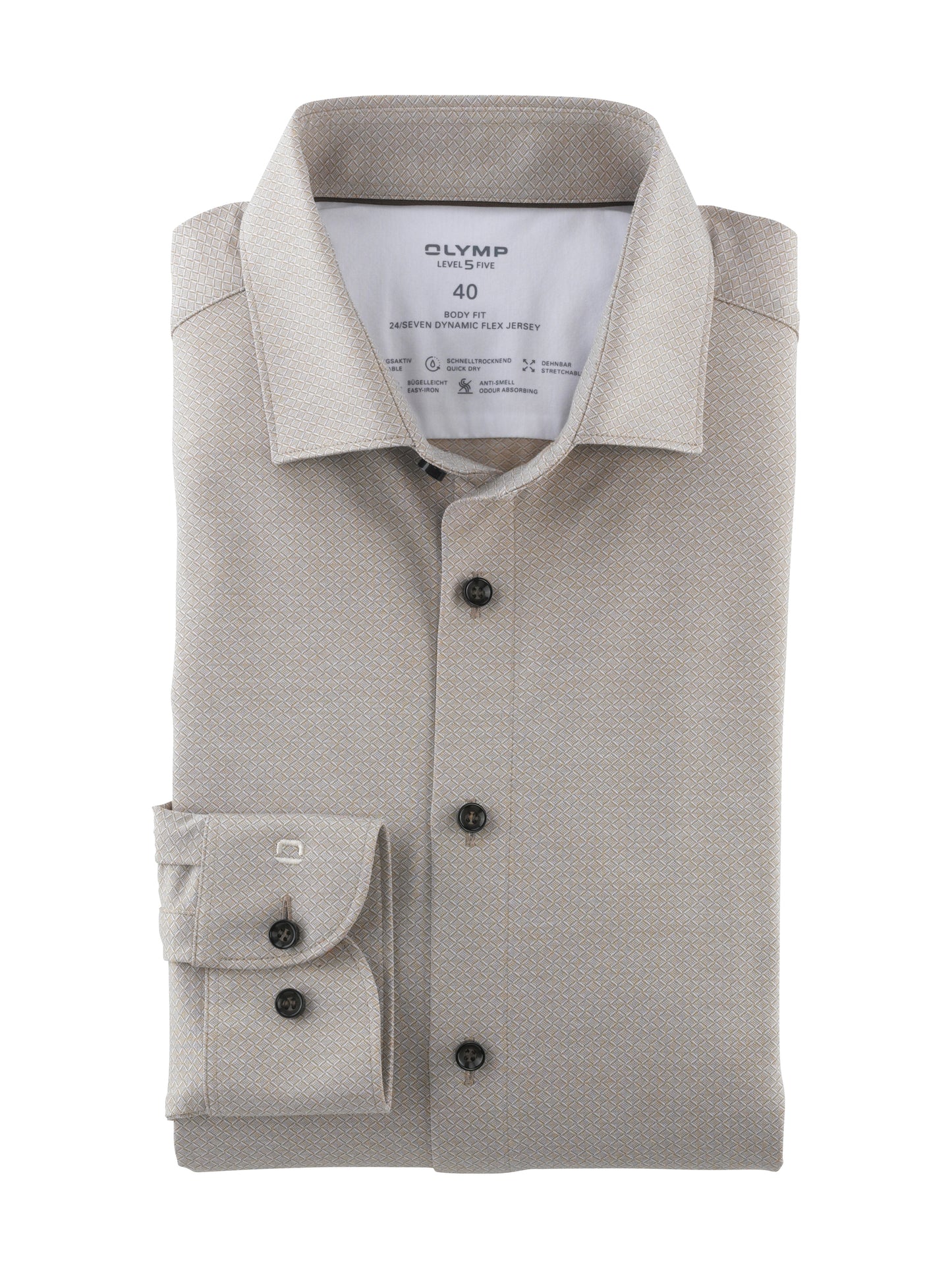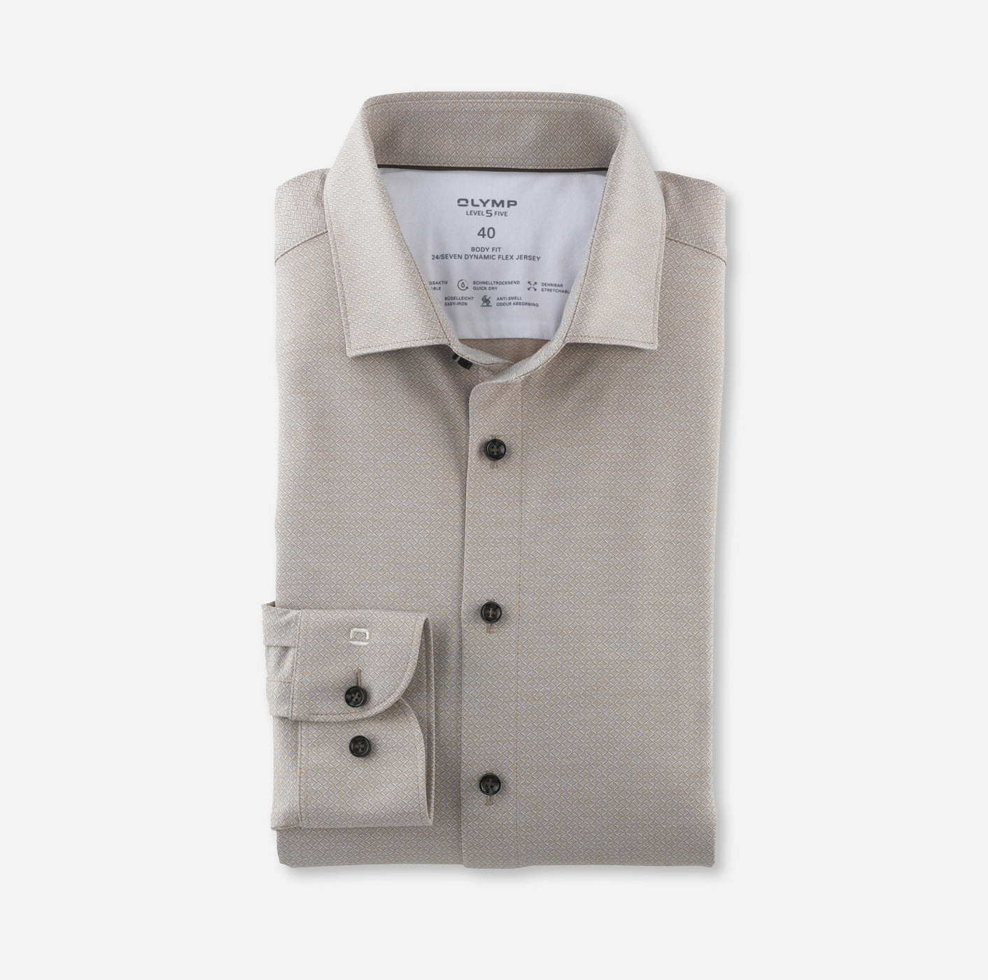 Hautsympathischer Tragekomfort in körperbetonter Body-Fit-Silhouette: Das innovative OLYMP Level Five 24/Seven Dynamic-Flex-Jersey ist die pflegeleichte Synthese aus sportlicher Eleganz und jugendliche Look. Ganz nach dem Motto, lässig wie ein T-Shirt, stilvoll wie ein Hemd. Die fein strukturierte Textur aus Bio-Baumwolle und geringem Elasthananteil mit tonalem Webmuster überzeugt seriös im Geschäftsleben wie im Homeoffice oder dem relaxten Afterwork-Szenario. Vollendet durch einen smarten Modern Kent mit weicher Krageneinlage für den korrekten und angenehmen Sitz.92% Baumwolle, 8% Elasthan