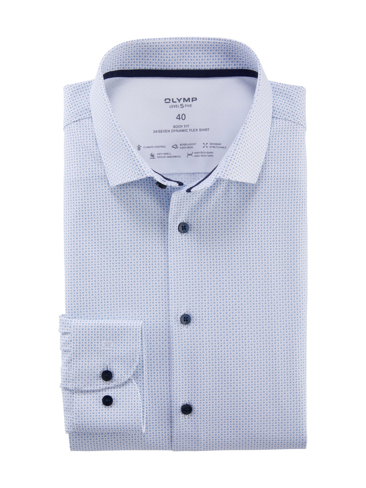 Gerade an hitzigen Tagen eine coole Lösung bieten die OLYMP Hemden mit CLIMATE-CONTROL-Ausstattung. Bei diesem OLYMP Level Five trifft modernstes High-Tech-Garn auf eine klassische Business-Optik, verarbeitet zu einer leichten, glatten Qualität mit stilvollem Minimal-Dessin in Bleu. Als Modell der Linie 24/Seven Dynamic Flex Shirt bietet der leistungsstarke Business-Begleiter nicht nur hoch dehnbare, sondern auch geruchsneutralisierende und bügelleichte Eigenschaften. Ein trendaktueller Modern-Kent-Kragen rundet den Look harmonisch ab.64% Baumwolle, 27% Polyester, 9% Elasthan
