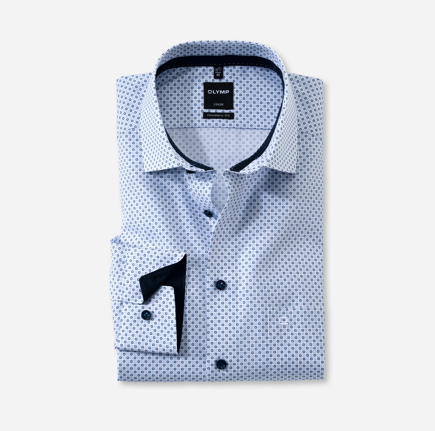 Reine, nachhaltig produzierte Baumwollfasern, pixelscharfer Digital-Print in innovativem Minimal-Dessin und attraktiver, leicht taillierter Linienführung erregen Aufmerksamkeit. Die raffinierte Farb- und Musterkomposition dieses OLYMP Luxor modern fit Businesshemds und der dynamisch-elegante Global Kent spielen perfekt zusammen und setzen ein individuelles Statement im Geschäftsalltag. Wie gewohnt pflegeleicht und knitterfrei. Mit kontrastierendem Uni-Besatz der Krageninnenseite.100% Baumwolle