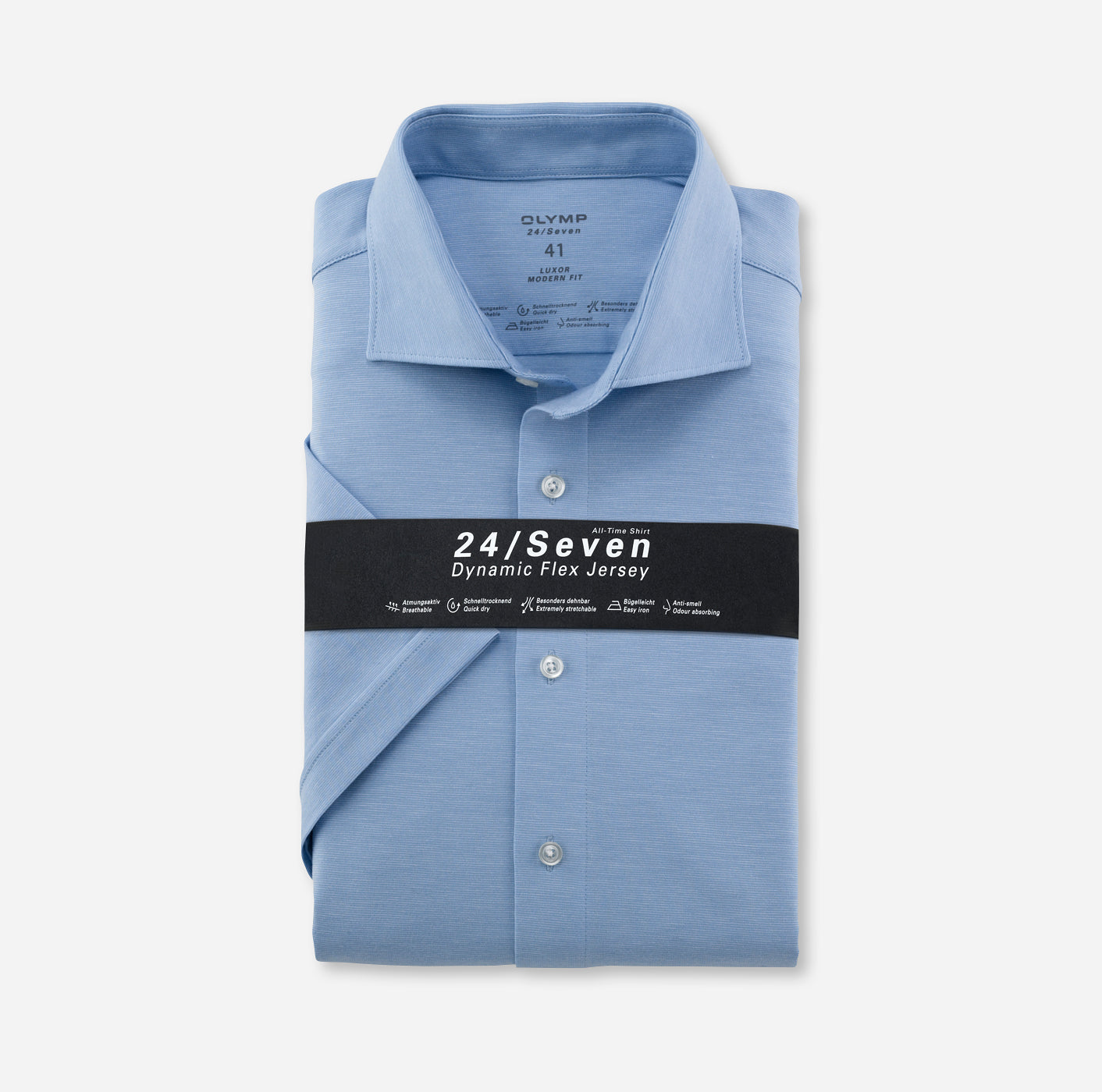 Weicher, sehr elastischer und atmungsaktiver Jersey, der Körpergeruch absorbiert, schnell trocknet und sich leicht bügeln lässt – das ist die zeitgemäße, entspannte und seriöse Form, ins Business zu starten. Die OLYMP Luxor modern fit Kurzarm-Hemden aus Dynamic-Flex-Jersey sind bequem wie ein T-Shirt und gleichzeitig so stilvoll wie ein Hemd, das die sportlich körperbetonte Form den ganzen Arbeitstag und darüber hinaus ganz ohne Knitter hält. 24/Seven eben. In feiner Strickstruktur und klassischem Kent sorgt es für die lässige Performance der jungen Start-up-Generation genauso wie für den routiniert erfolgreichen Auftritt sportlich trainierter Seniors im Business.56% Lyocell, 37% Baumwolle, 7% Elasthan