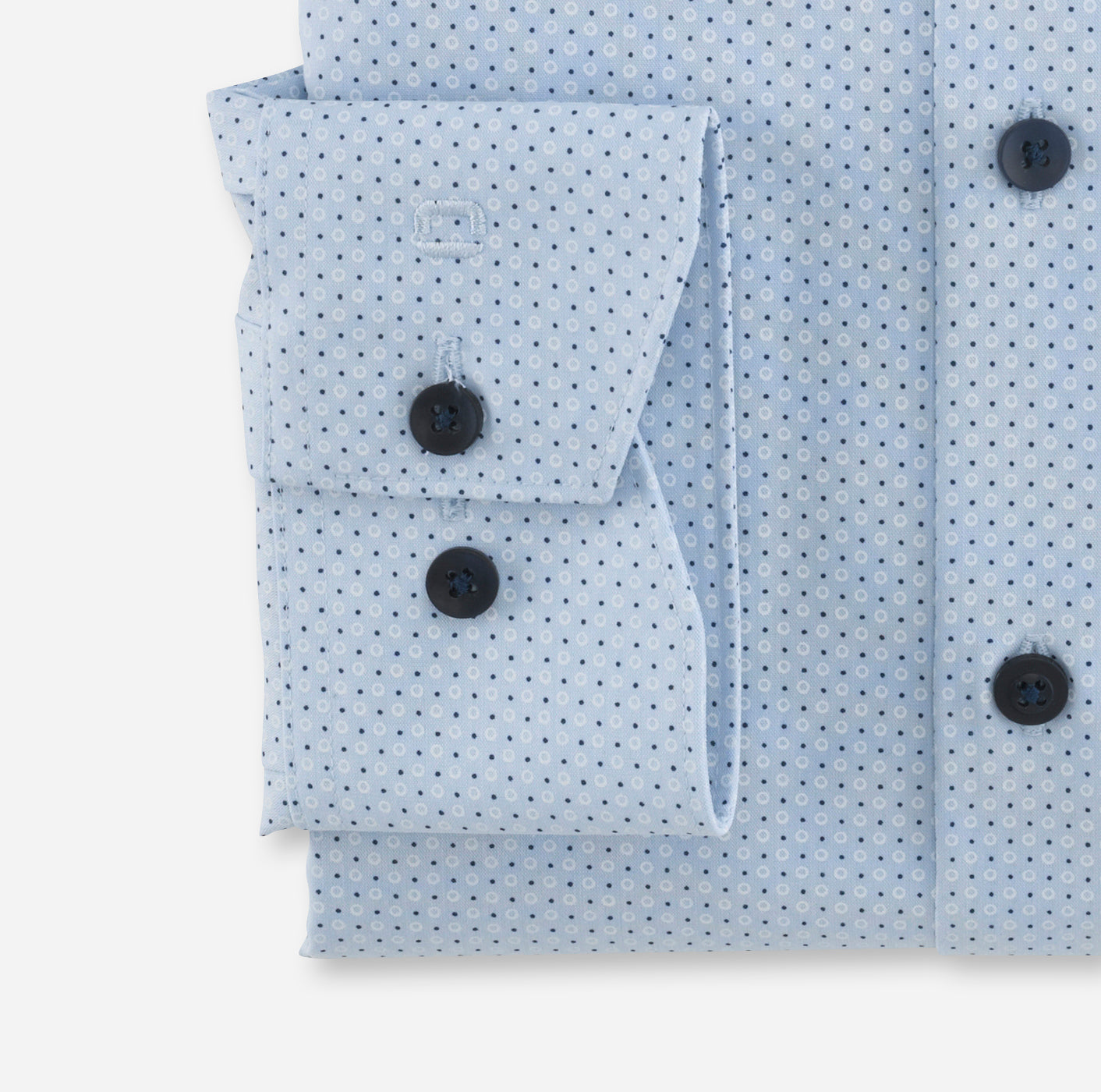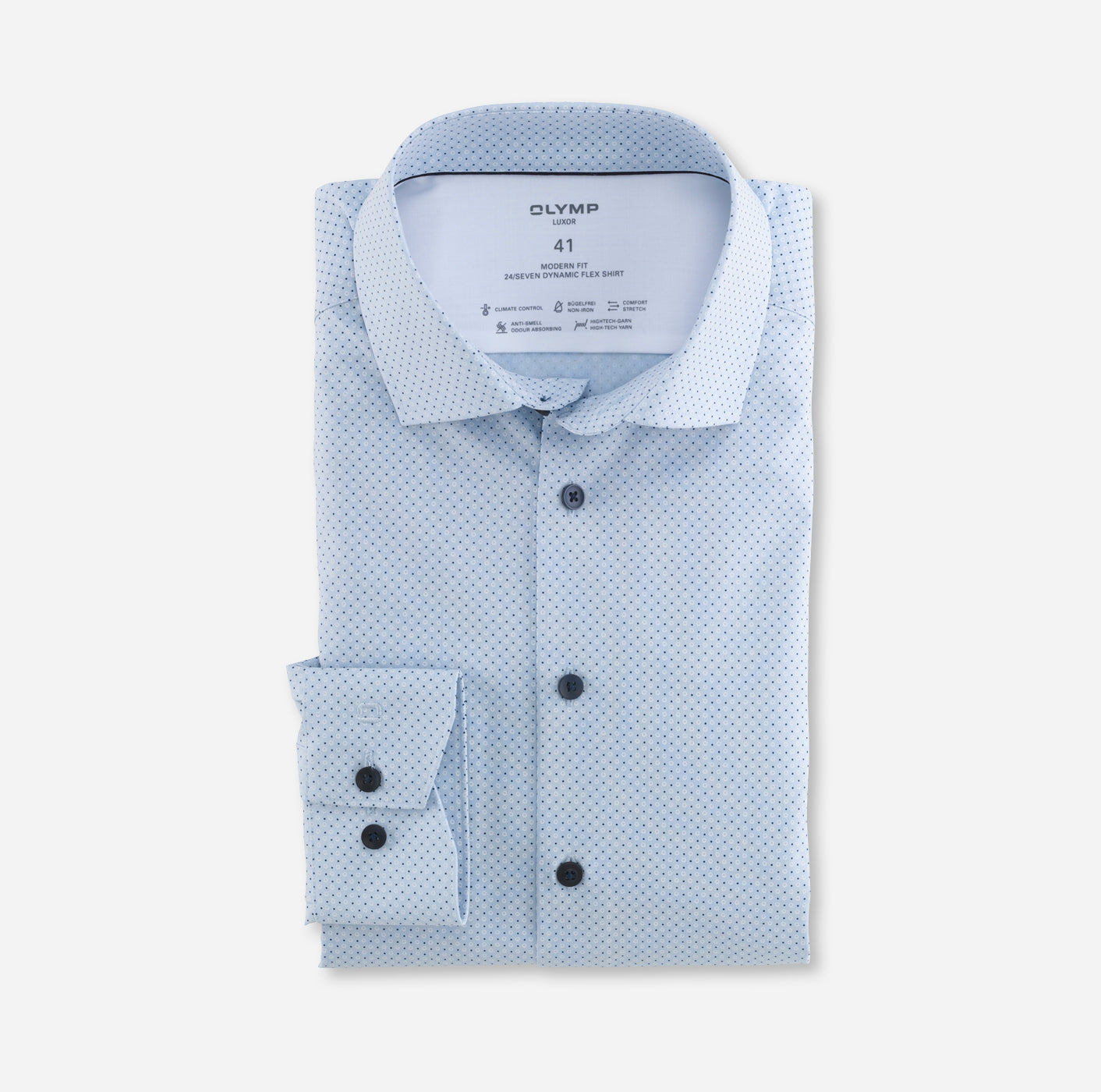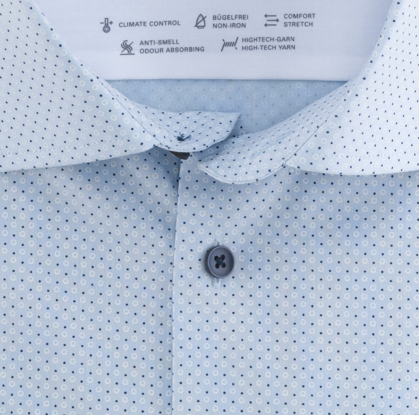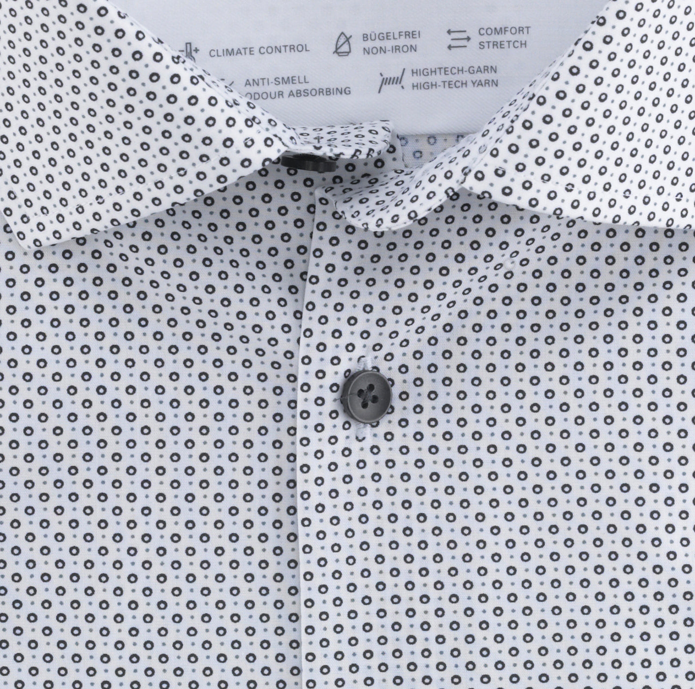 Attraktive Micro-Dessins, körpernahe Silhouette und High-Tech-Fasern sind der nächste evolutionäre Sprung in der Linie OLYMP Luxor 24/Seven modern fit. Der dehnbare Dynamic-Flex-Jersey addiert zu den bewährten Eigenschaften Atmungsaktivität, Bügelleichtigkeit und schneller Trocknung weitere spezielle Funktionen. CLIMATE CONTROL heißt, die gewebte Fasermischung aus Baumwolle, Polyester und Elasthan ist feuchtigkeits- sowie temperaturregulierend und bewältigt jede Klimazone. Die gewebte Textur bleibt auch bei höchster Beanspruchung cool, hautsympathisch und extrem formstabil.64% Baumwolle, 27% Polyester, 9% Elasthan