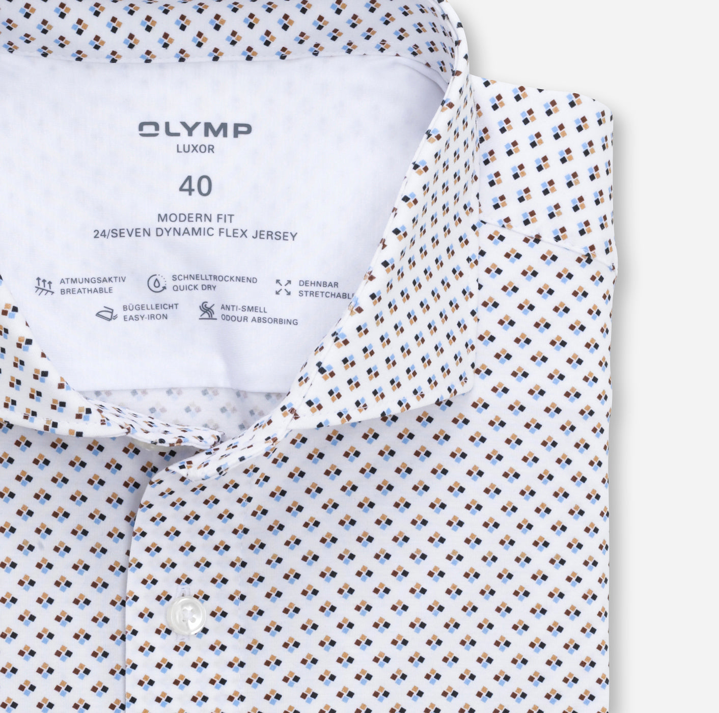 Ausdrucksstarke Micro-Dessins ergänzen die aktuelle Businessmode und bringen mit OLYMP Individualität und Kreativität in den Office-Alltag. Das atemberaubende OLYMP Luxor modern fit 24/Seven Dynamic-Flex-Jersey zeichnet sich durch die weiche, sehr elastische und atmungsaktive Textur aus. Das hautsympathische und funktional entwickelte Material absorbiert Körpergeruch, trocknet schnell und ist leicht zu bügeln. Nachhaltig produziert, körpernah geschnitten, harmonisch komponiert, vollendet mit klassischem Kent: bequem wie ein T-Shirt, stilvoll wie ein Hemd. OLYMP – Style und Statement für den Mann von heute.92% Baumwolle, 8% Elasthan