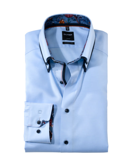 Die Spur Extravaganz zu besonderen Business-Abschlüssen macht den Unterschied zum klassischen Uni-Dresscode. Reiner Baumwoll-Twill in traditioneller Businessfarbe Hellblau feinste Webart und der kontrastvolle Eyecatcher eines Doppelkragens mit wirkungsvollem Print-, Uni- und Twill-Besatz präsentieren sich äußerst ansprechend. Selbstverständlich stehen die funktionalen Attribute wie Knitter- und Bügelfreiheit aller OLYMP Luxor modern fit Businesshemden auch hier ohne Einschränkung zur Verfügung. Ohne Brusttasche.100 % Baumwolle