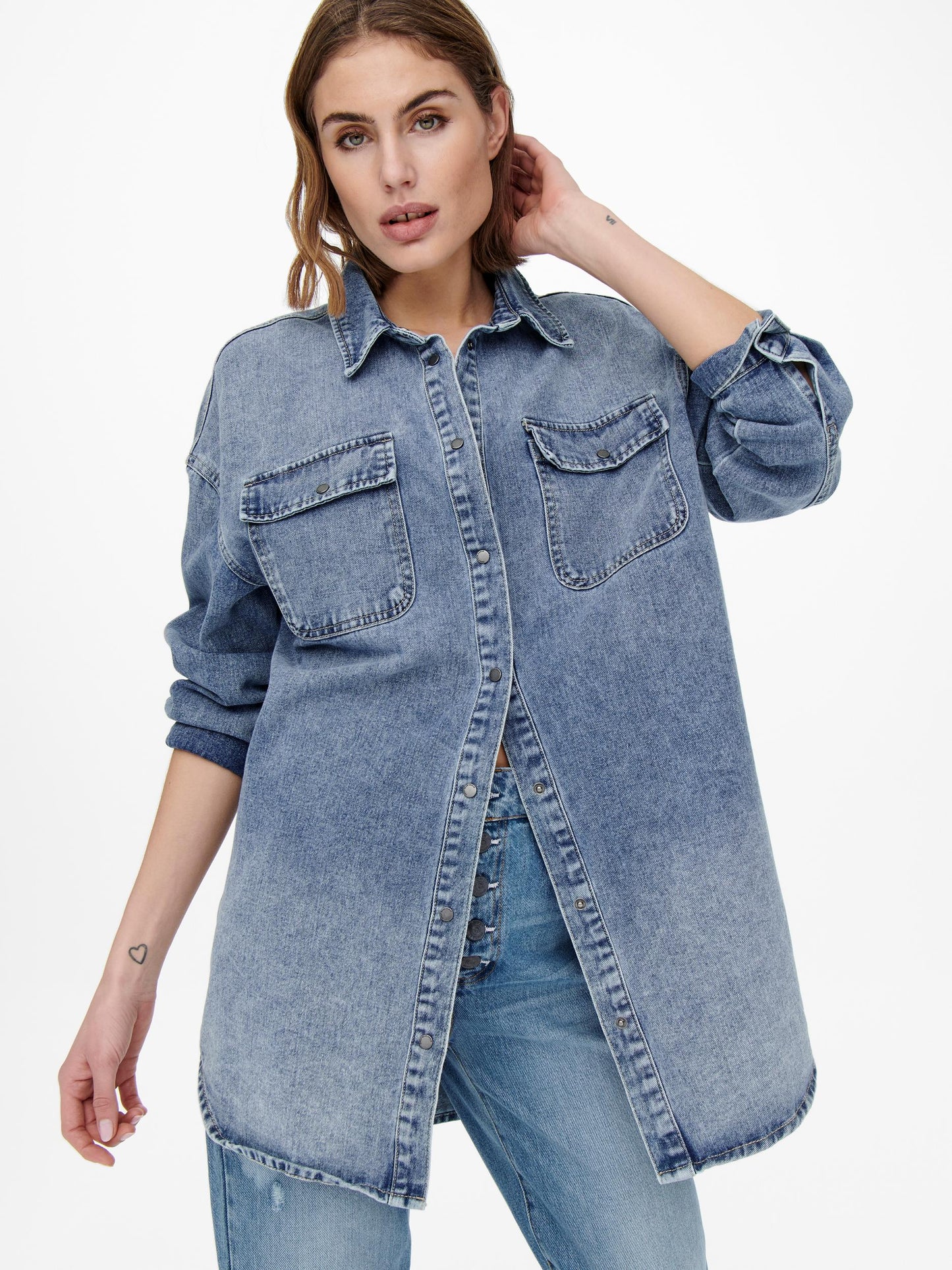 - Langes Oversize-Jeanshemd- Geknöpfte Vorderseite- 2 Brusttaschen mit Patte und Knopf- Lange Ärmel mit geknöpften Bündchen- Länge: 84 cm in Größe S- Das Model trägt Größe S100% Baumwolle