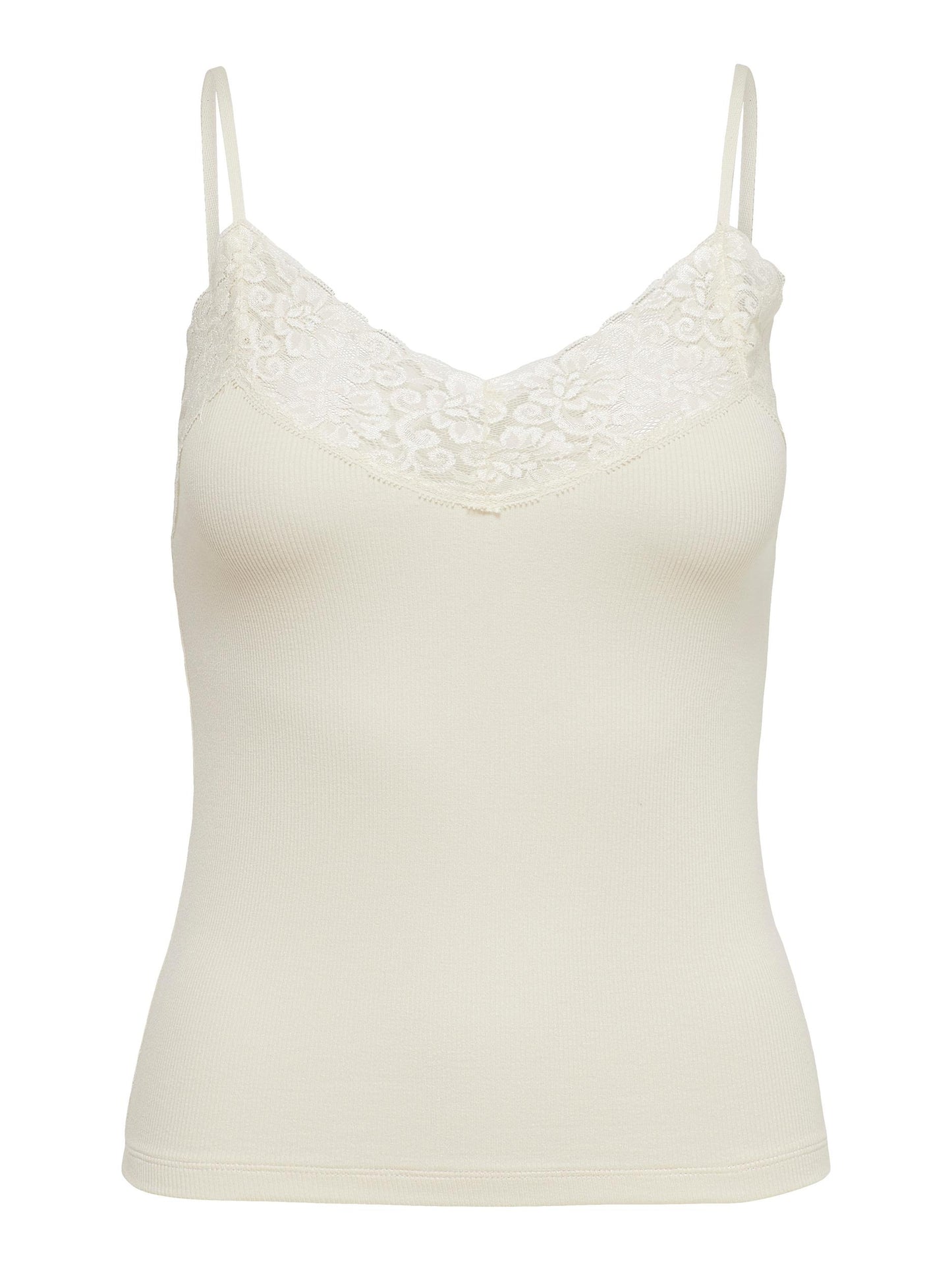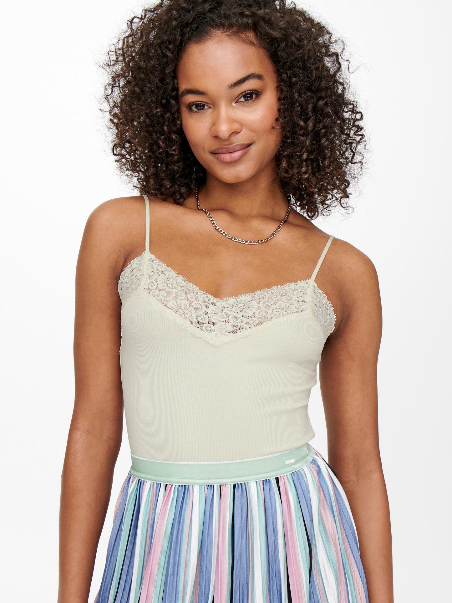 - Trägertop mit Spitze- Körperbetont- Einfarbig- V-Ausschnitt vorn mit Spitze- Spitzendetail am Rücken- Schmale, verstellbare Träger- Länge: 56 cm in Größe S- Das Model trägt Größe S95% Viskose, 5% Elasthan