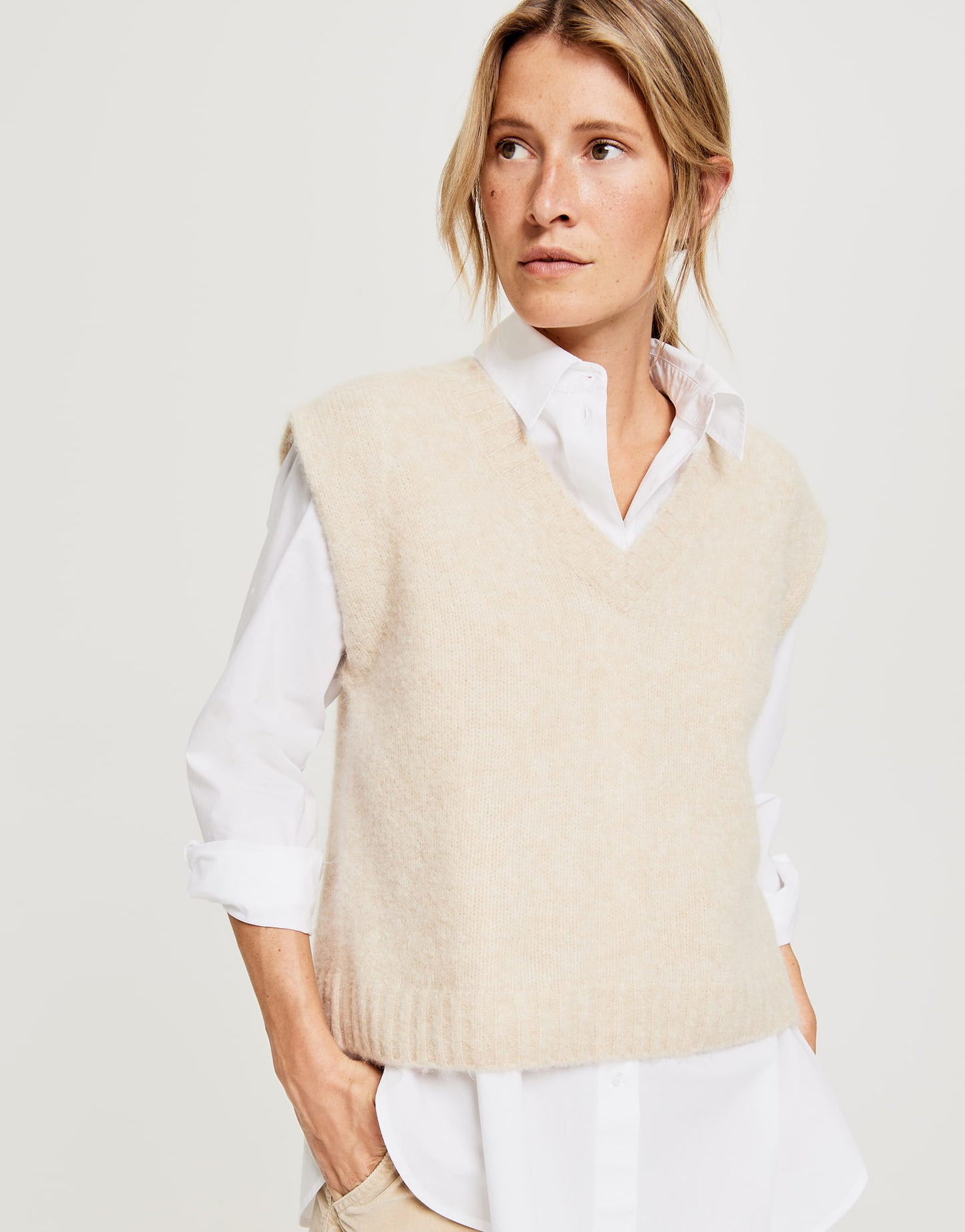 Woll-Mix, gerade geschnitten, weicher Griff, V-Ausschnitt, Schulterbetonung, das Model ist 176 cm groß und trägt Größe 3653% Polyacryl, 23% Polyamid, 10% Wolle, 10% Mohair, 4% Elasthan