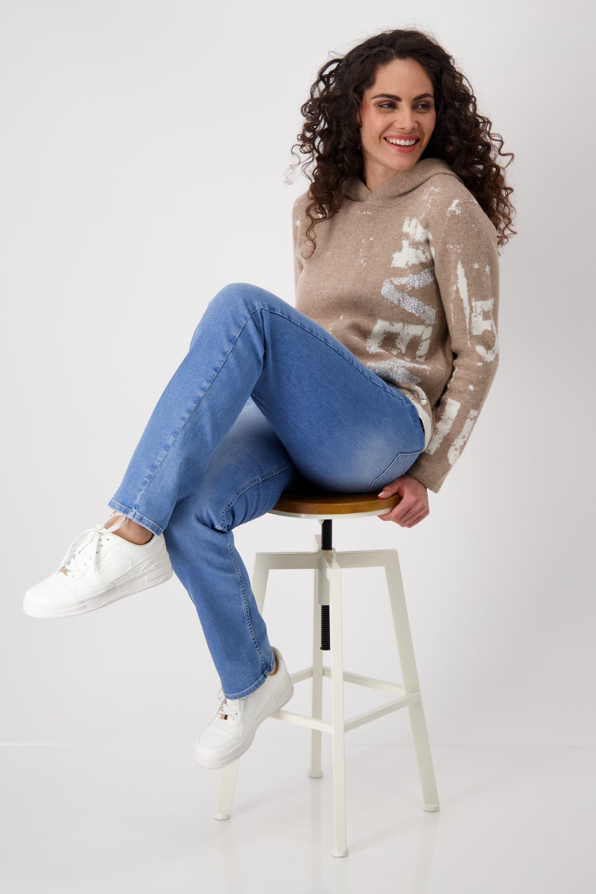 Dieser Strickpullover besticht durch sein Jacquard-Design mit auffälliger Schrift und funkelnden Strasssteinen. Die Kapuze sorgt für zusätzlichen Komfort.Außenmaterial: 50 % Wolle, 25 % Polyamid, 25 % Viskose