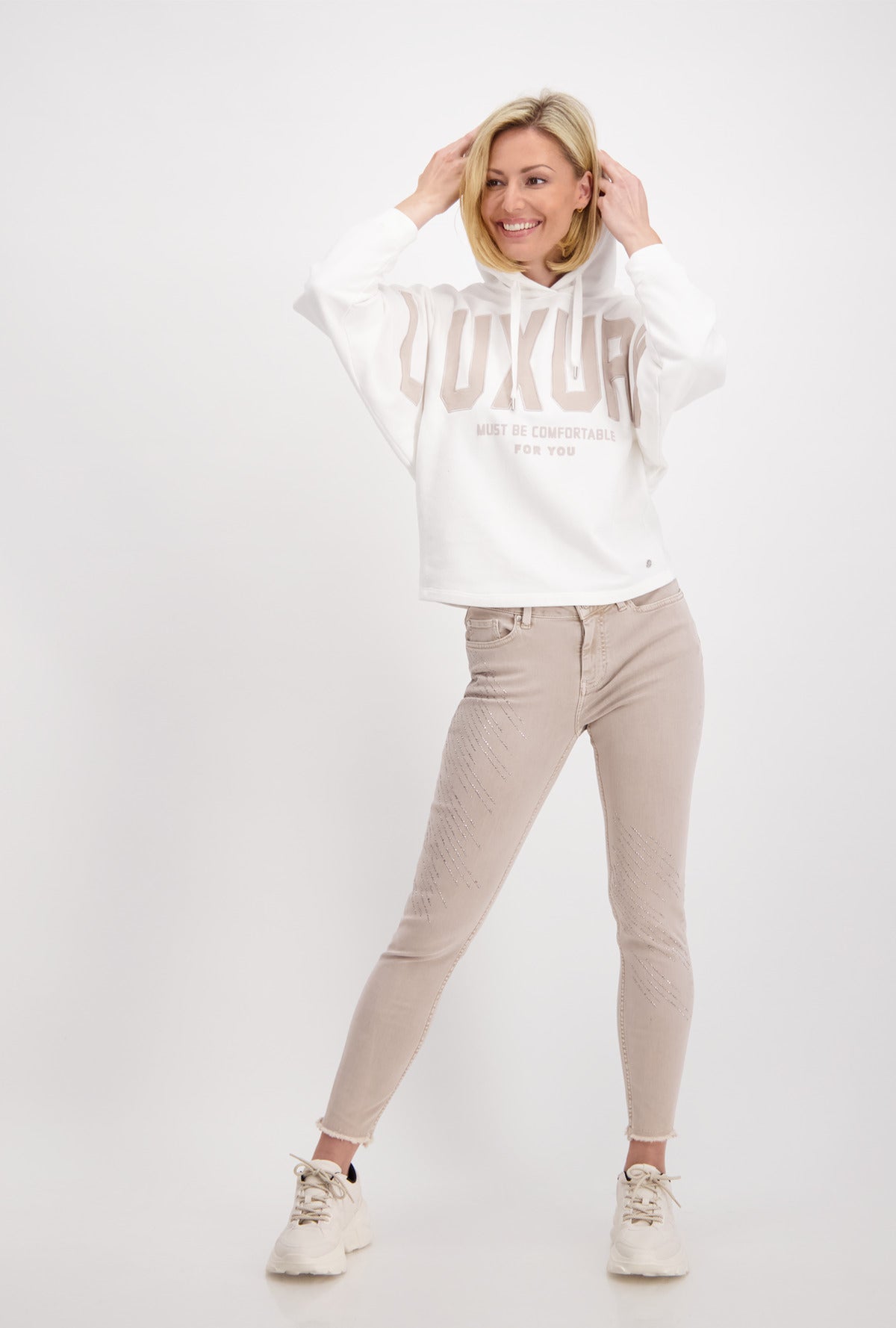Entdecken Sie mit diesem Jersey-Sweatshirt von monari Ihre Lieblingskombis für angesagte Looks. Das vielseitige, gerade geschnittene Sweatshirt kommt mit Kapuze, weiten Ärmeln, Bündchen an den Ärmelenden und überschnittenen Schultern. Ein kontrastfarbiges 3-D-Wording aus Stoff mit glänzender Lurex-Stickerei schmückt die Vorderseite von Ärmel zu Ärmel und sorgt somit für einen stilvollen Hingucker-Effekt. Ein hoher Tragekomfort ist durch den Baumwoll-Mix garantiert! Passend zur Slim-Fit-Jeans mit funkelnden Strassdetails.80% Baumwolle, 20% Polyester