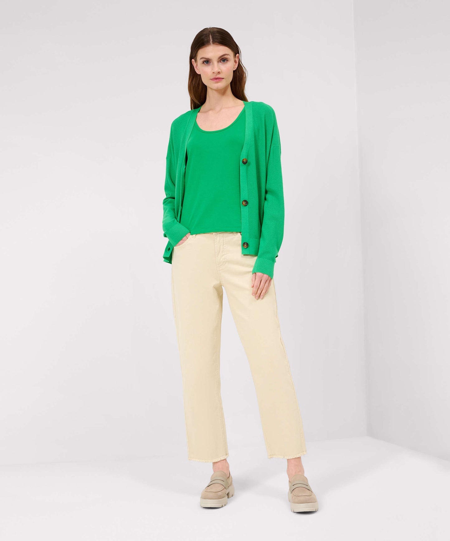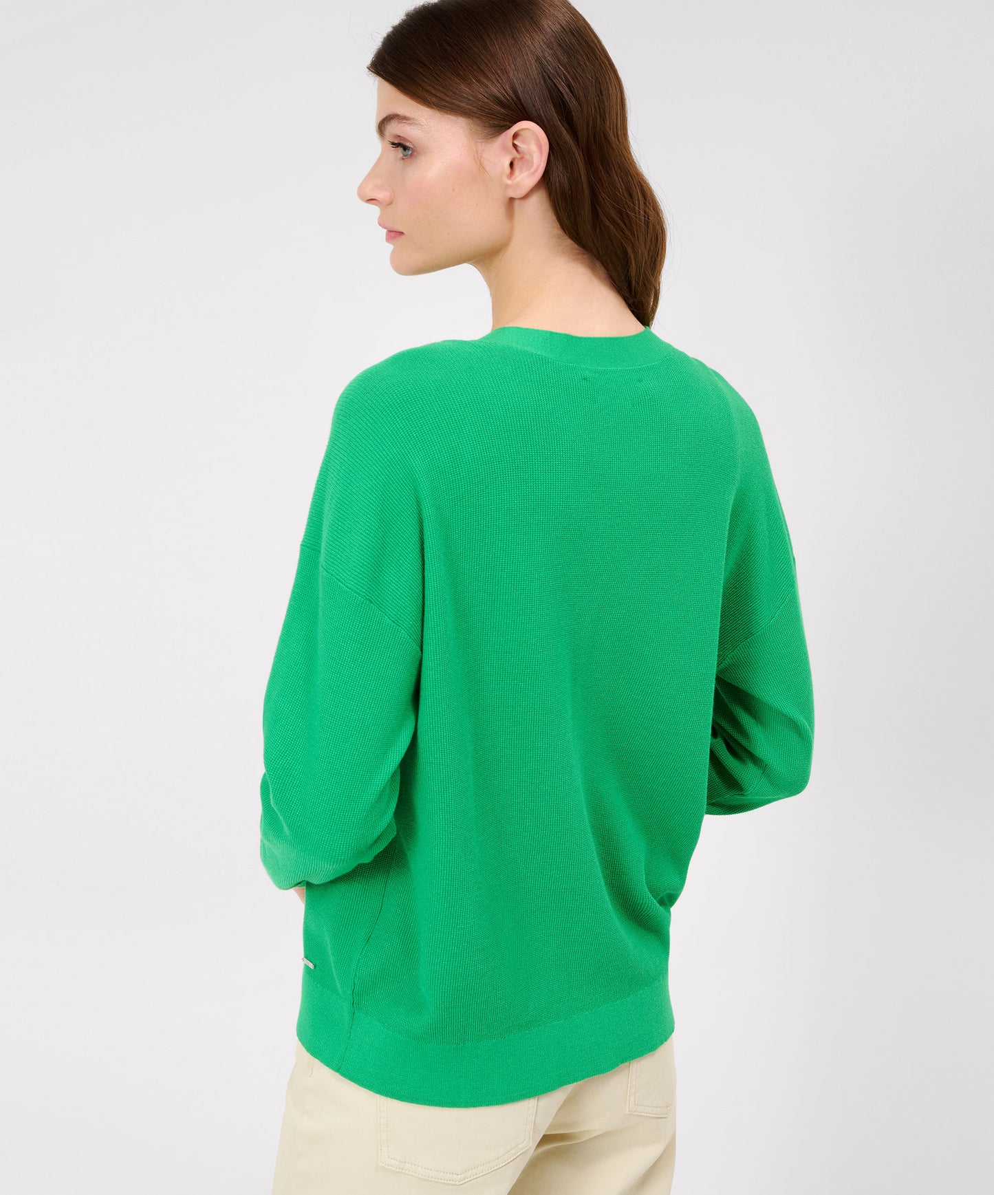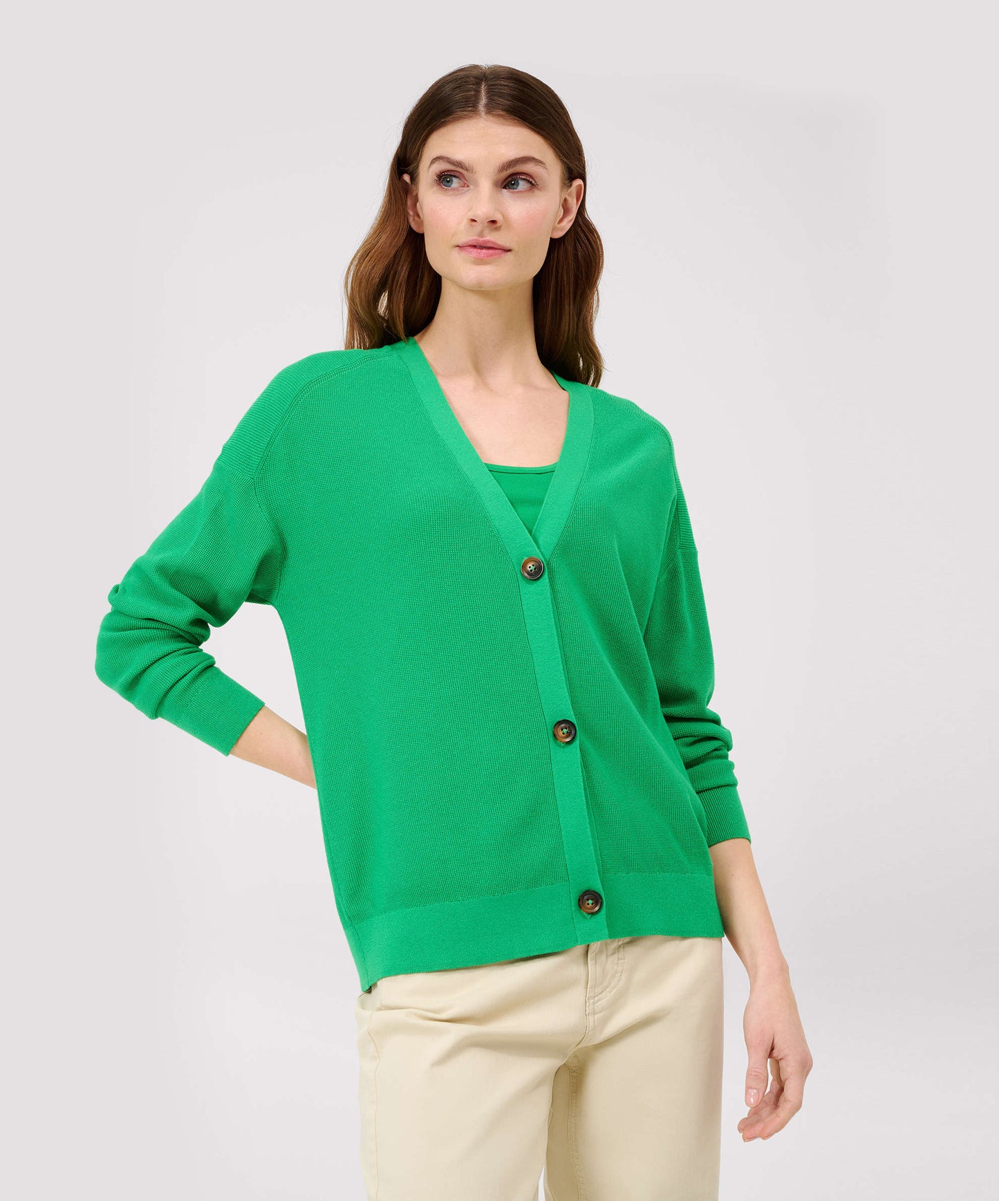 Der Cardigan für Damen im Style Alicia verbindet Modernität und Komfort und ist ein Must-Have für Ihre Garderobe. Die gerade Silhouette bietet eine zeitlose Passform, die sich mühelos in Ihren smarten Look integrieren lässt. Der V-Neck-Ausschnitt unterstreicht dabei die klassische Eleganz, während die markanten Knöpfe einen modernen Akzent setzen. Besonders hervorzuheben ist das Reiskorn-Strickbild, das dem Cardigan eine interessante Textur und einen unverwechselbaren Charakter verleiht. Der nachhaltige Viskose-Polyamidmix sorgt für eine ansprechende Optik sowie ein angenehmes Tragegefühl. Die Kombination aus weicher Viskose und strapazierfähigem Polyamid steht für Langlebigkeit und Formbeständigkeit, sodass Sie lange Freude an dieser Strickjacke haben werden.Form: