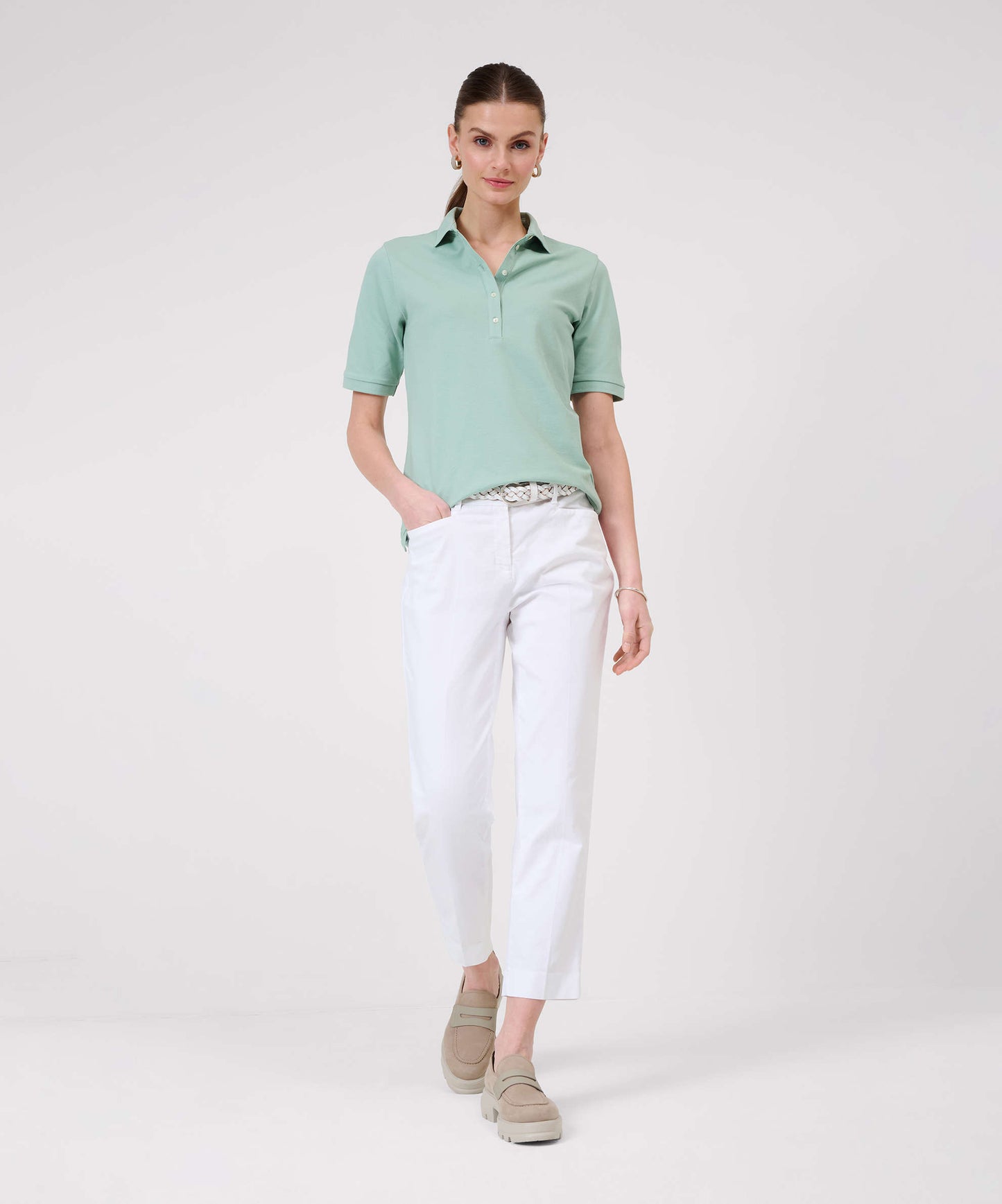 Ein Essential für einen klassisch-sportiven Casual Look ist das Poloshirt im Style CLEO. Mit dem typischen Polokragen, einer leicht taillierten Silhouette und einer umfangreichen Farbpalette ermöglich das Damenpolo vielfältige Kombinationsmöglichkeiten. Sportlich in der Optik, aber immer gepflegt. Dafür sorgt bei diesem Polo auch die feine Piqué-Qualität aus einem hochwertigen Baumwoll-Elasthan-Mix. Die Baumwolle bietet hohe Tragefreundlichkeit und eine softe Haptik, während der Elasthan-Anteil eine flexible Passform garantiert.Form: