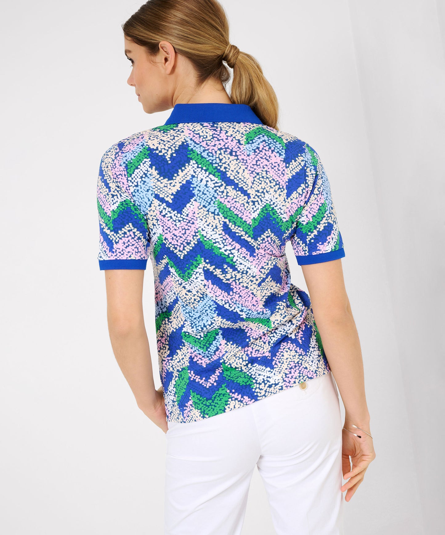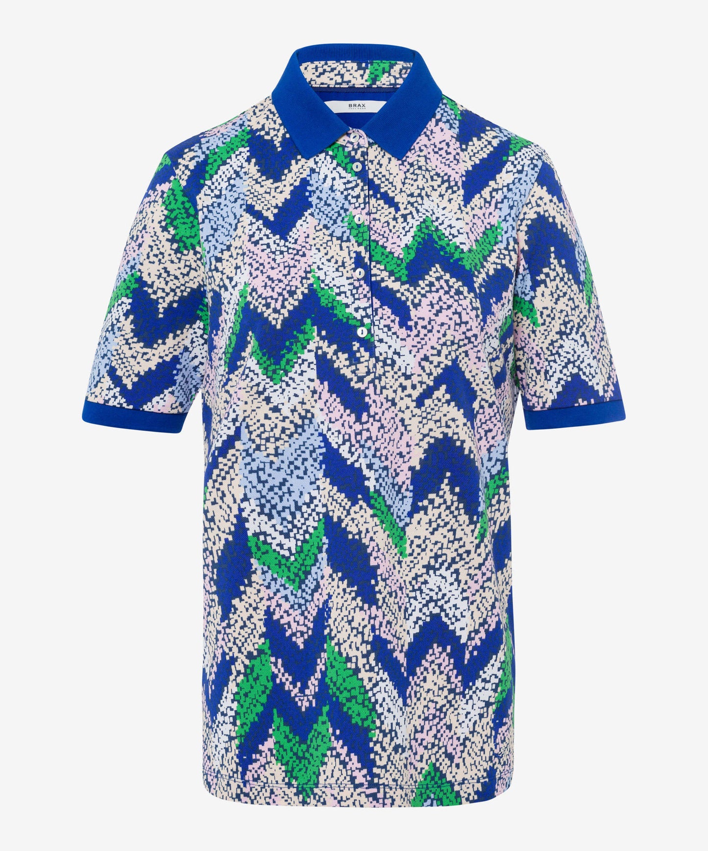 Das Poloshirt für Damen im Style Cleo besticht durch seine gerade Silhouette, die eine zeitlose Eleganz verspricht. Ein optisches Highlight setzt der farblich abgesetzte Kragen zusammen mit den Ärmelabschlüssen, die dem Shirt einen frischen und sommerlichen Look verleihen. Der grafische Alloverprint fügt eine spielerische Note hinzu und macht das Shirt zu einem echten Hingucker für die warmen Tage. Hergestellt aus einem hochwertigen Mix aus Baumwolle und Elasthan, bietet dieses Poloshirt eine angenehme Tragbarkeit mit genügend Bewegungsfreiheit. Die Baumwolle sorgt für ein weiches Hautgefühl und Atmungsaktivität, während der Elasthananteil eine optimale Passform und Formbeständigkeit garantiert.Form: