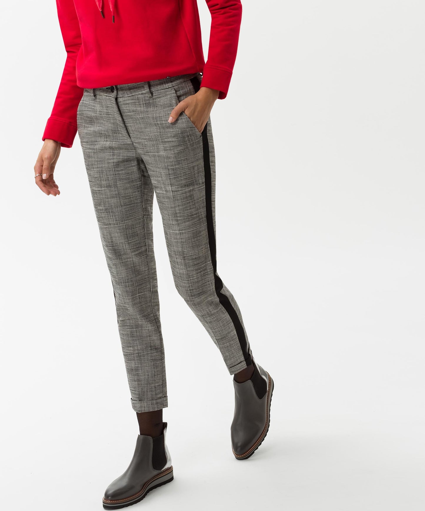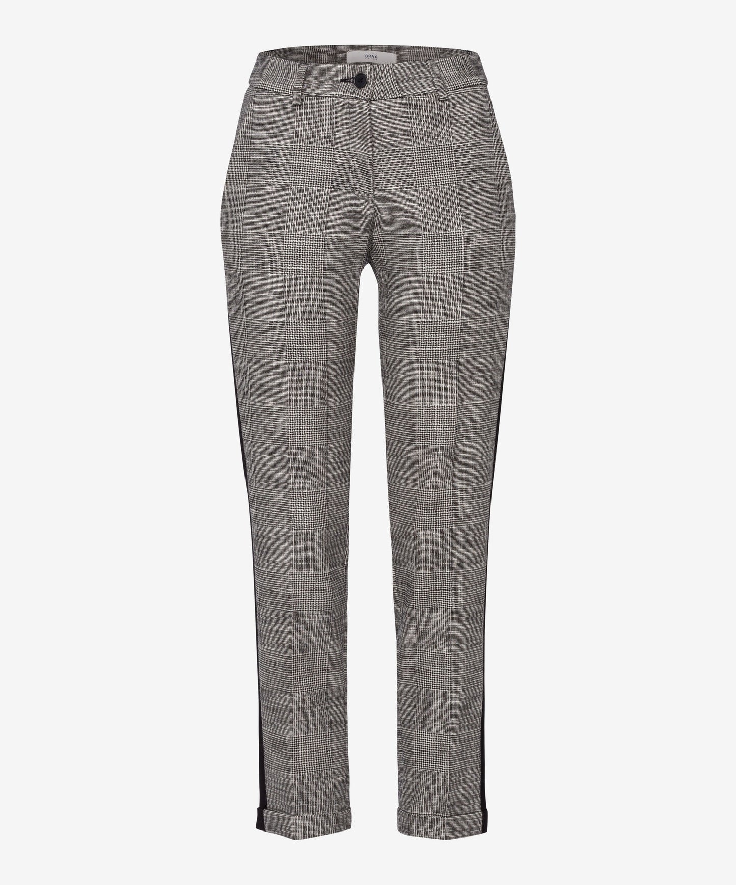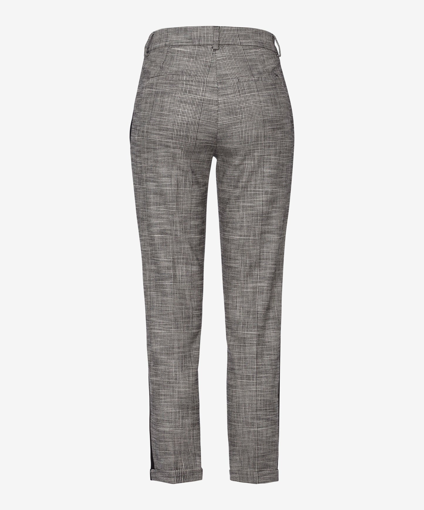 Check in for winter. Karo ist das It-Muster der Saison und ziert hier als klassischer Glencheck diese Damenhose. Neben Muster setzt die moderne Slim Chino auf eine elegante Interpretation des Athleisure Styles. Galonstreifen, Bund und Leistentaschen sind mit tonigem Satinstoff veredelt. Und selbst die Knöpfe sind mit feinem Satin bezogen. Abgerundet wird die edle Optik der Damenhose mit einem klassischen Bügelbruch. Perfekt umgesetzt in einem wollähnlichem und damit winterlich anmutenden Oberstoff.