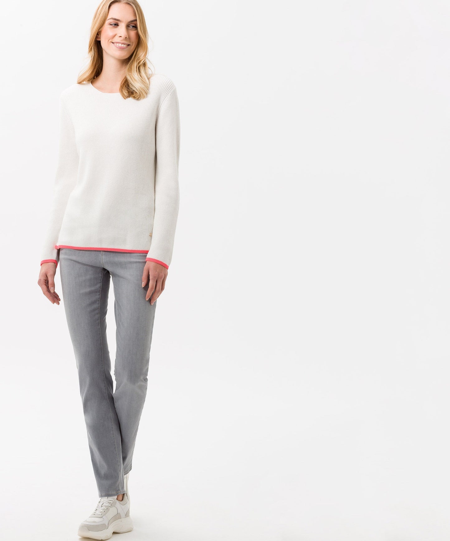 Weniger Wasser, Energie und Chemikalien, aber nicht weniger Denim. BRAX greift das Thema Nachhaltigkeit mit "Blue Planet" auf. Dieses Denim-Programm verbindet den bewussten Umgang mit natürlichen Ressourcen mit dem Anspruch an zeitgemäßer Mode. Durch die Verwendung umweltschonender Technologien, Waschverfahren mit Ozon sowie dem Einsatz modernster Lasertechnologie wird bei der Herstellung dieses exklusiven Denimartikels der Verbrauch von Wasser, chemischen Hilfsmitteln und Energie deutlich reduziert. So entsteht eine Damenjeans mit bewährter Passform, wertiger Ausstattung, wie den glänzenden Hotfix-Elementen auf der Gesäßtasche, und moderner Optik, die auch noch nachhaltig ist. Ein gutes Gefühl.Form: