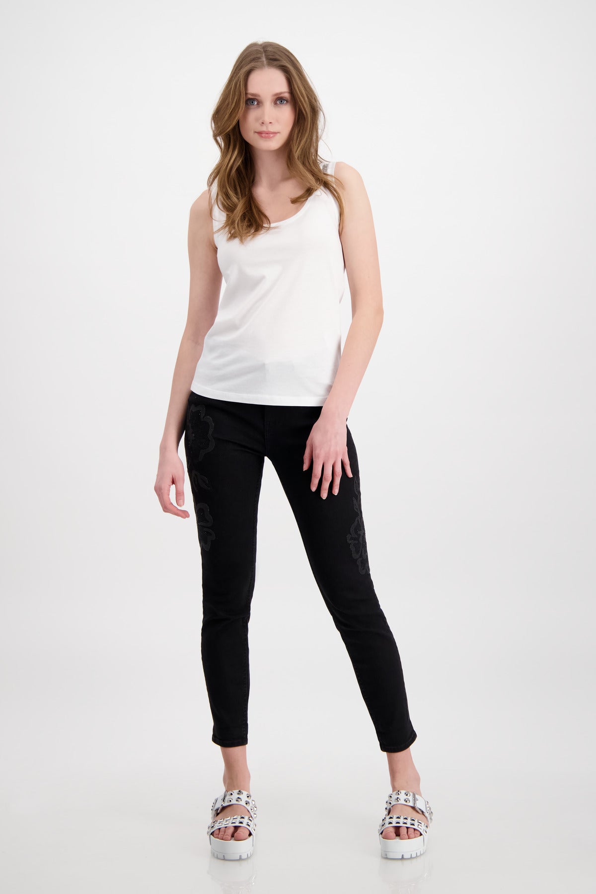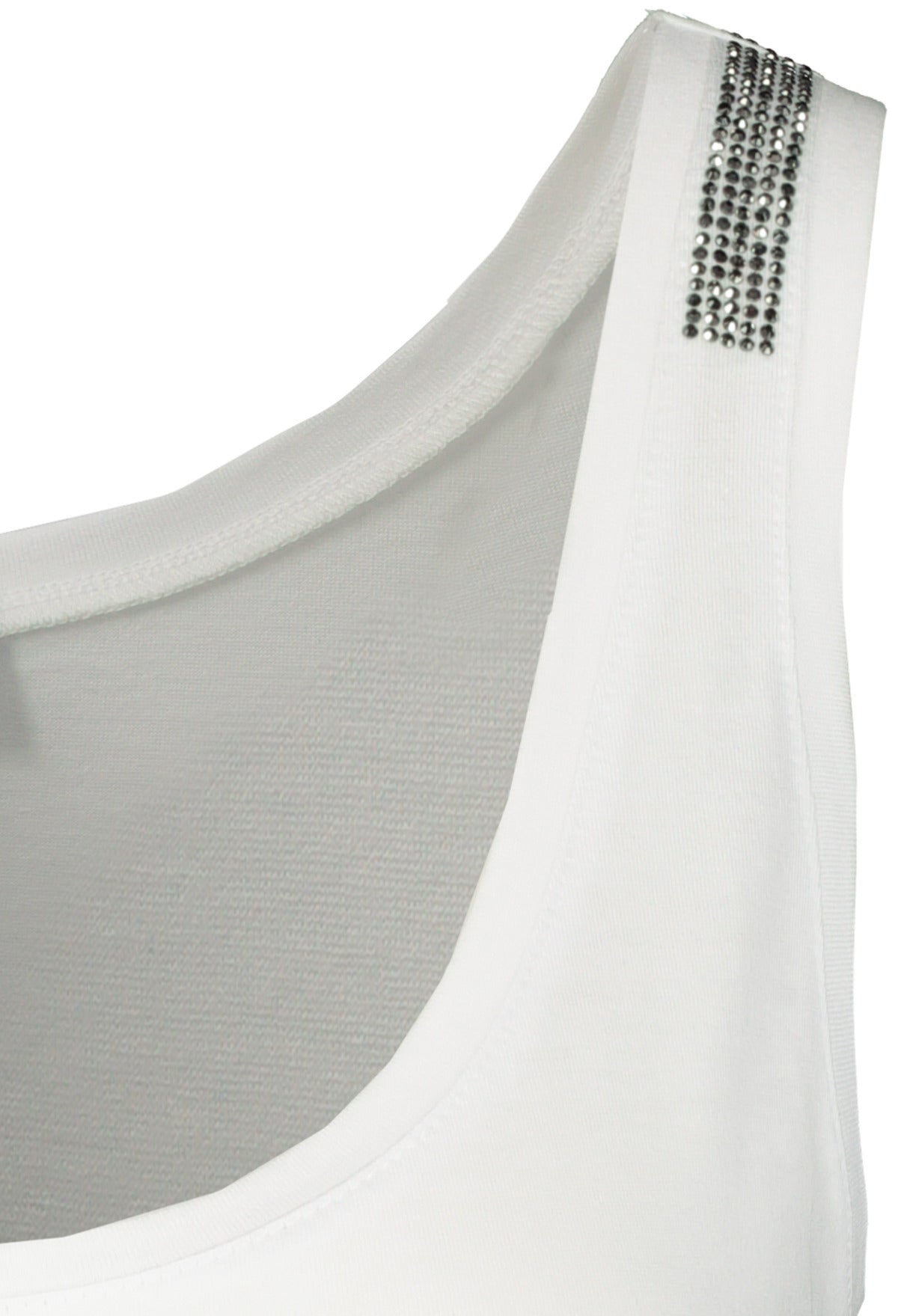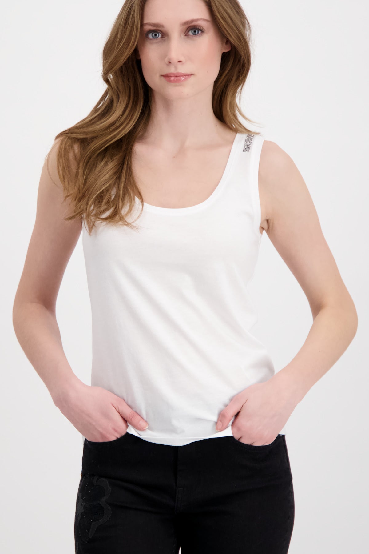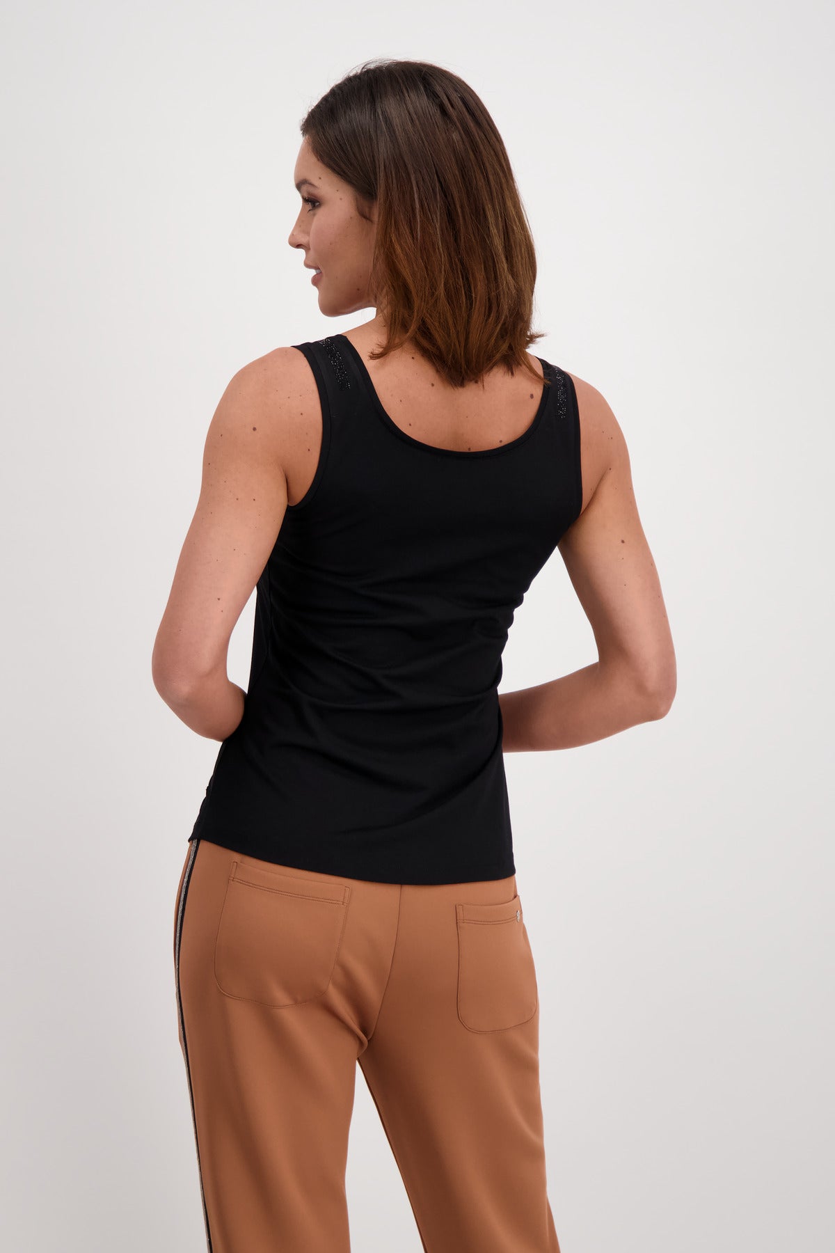 Ein hübsches Essential für jeden Kleiderschrank ist dieses qualitativ hochwertige Tanktop von monari. Der Regular Fit wird von einem Rundhalsausschnitt mit kleiner Blende und einem leicht abgerundeten Saum geprägt. Freuen Sie sich auf dieses unifarbene, ärmellose Modell mit funkelndem Strass Träger. Sagen Sie nicht Nein.50% Baumwolle, 50% Modal