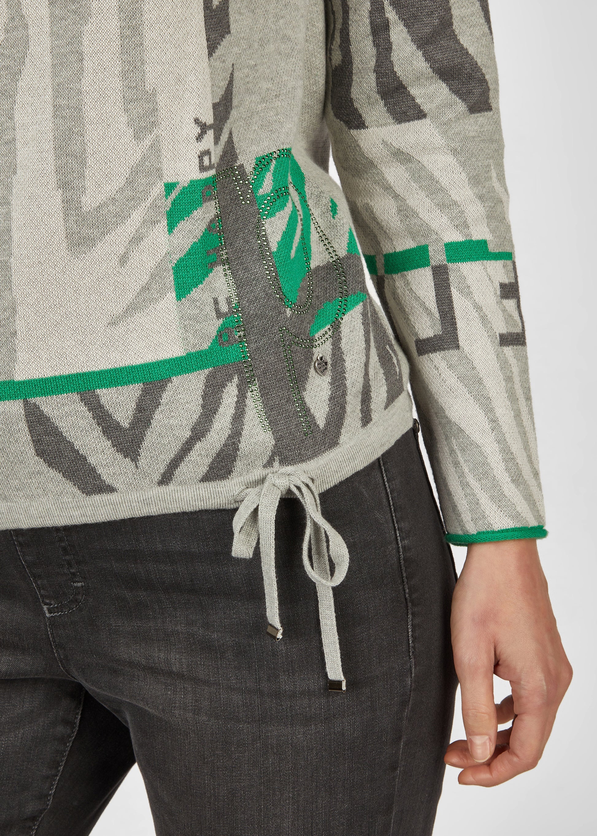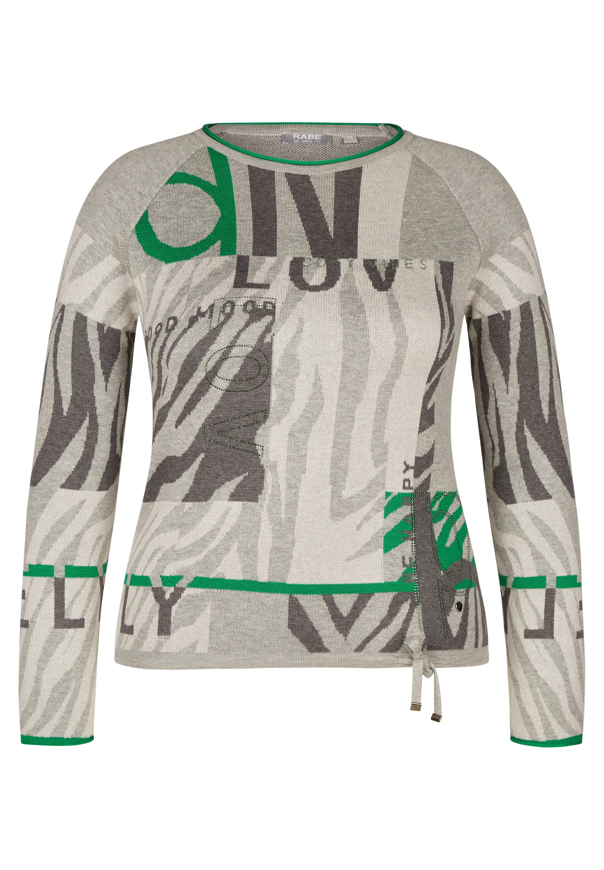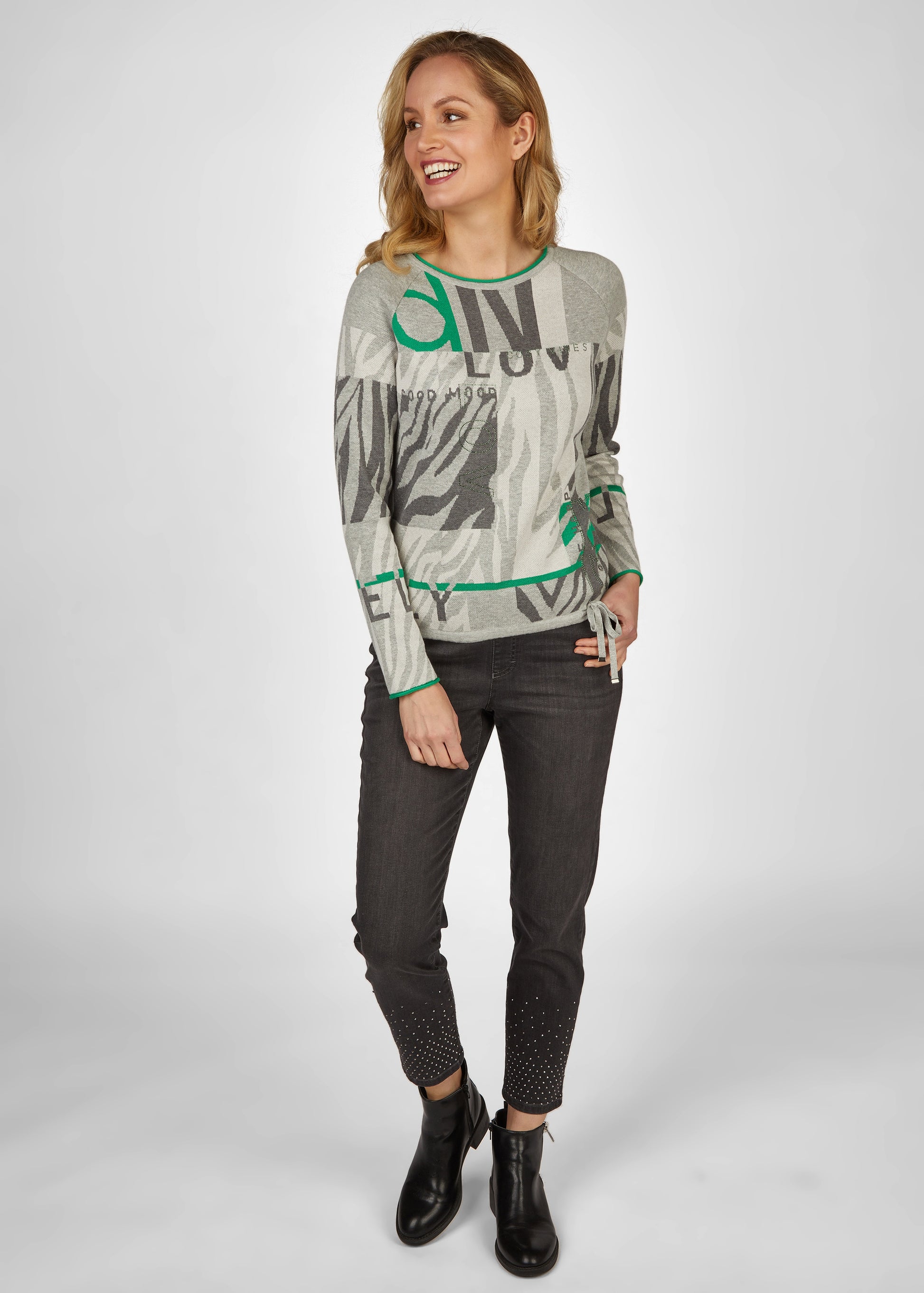 Unser trendiger Pullover mit grünen Akzenten ist ein absoluter Hingucker! Mit eleganten Bändern am Saum und funkelnden Strass Details verleiht er jedem Outfit das gewisse Extra. Das einzigartige Design kombiniert geschickt Wording und Animal-Motive und sorgt so für einen individuellen und stylischen Look. Holen Sie sich diesen modischen Pullover für die kommende Saison.50% Baumwolle, 50% Polyacryl