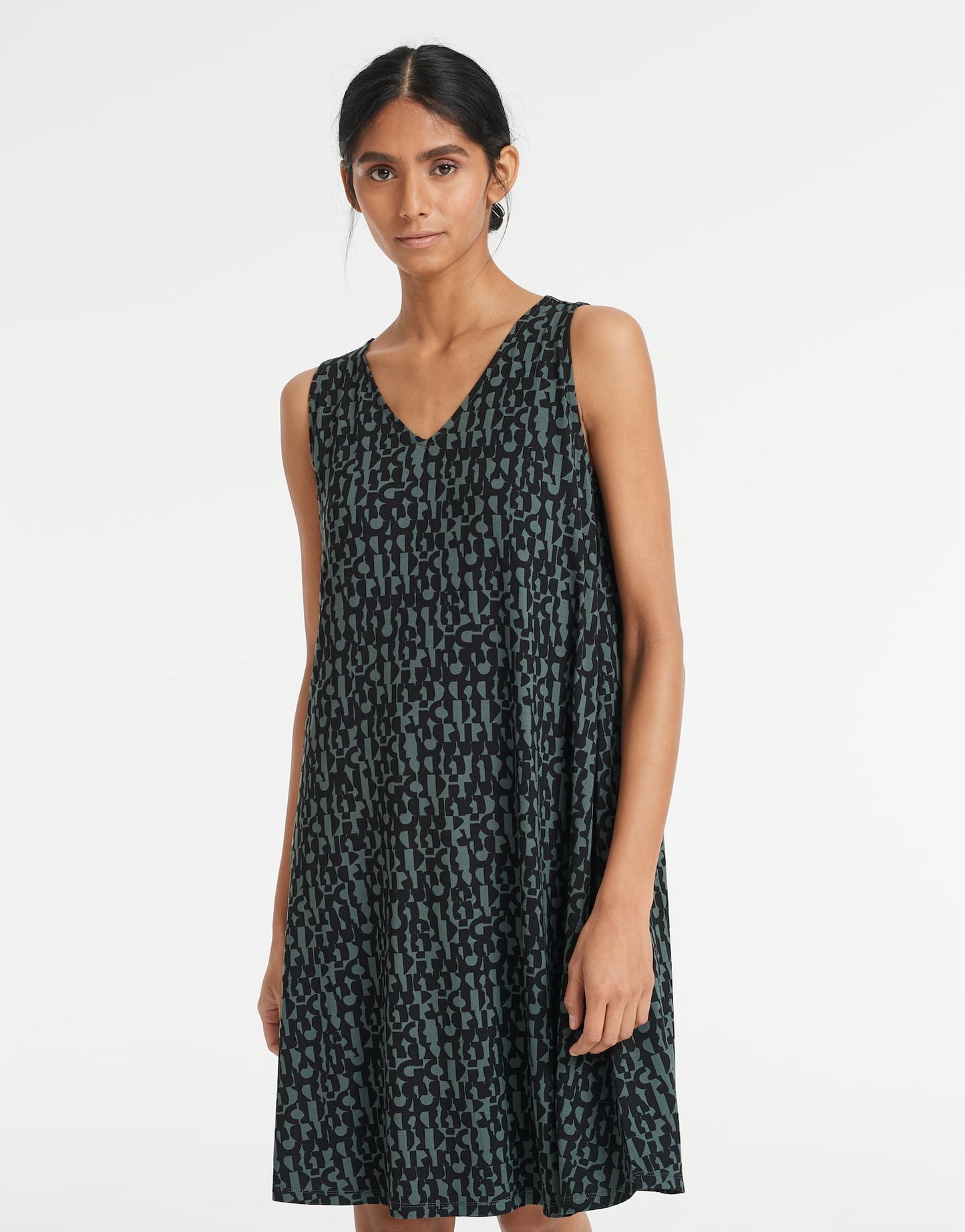ECOVERO Viskose Mix, kleiner All-Over-Print, A-Linie, kurz geschnitten, V-Neck, schwingender Fall, Längsnaht mit Falte im Rücken für mehr Volumen, das Model ist 176 cm groß und trägt Größe 3695% Viskose, 5% Elasthan